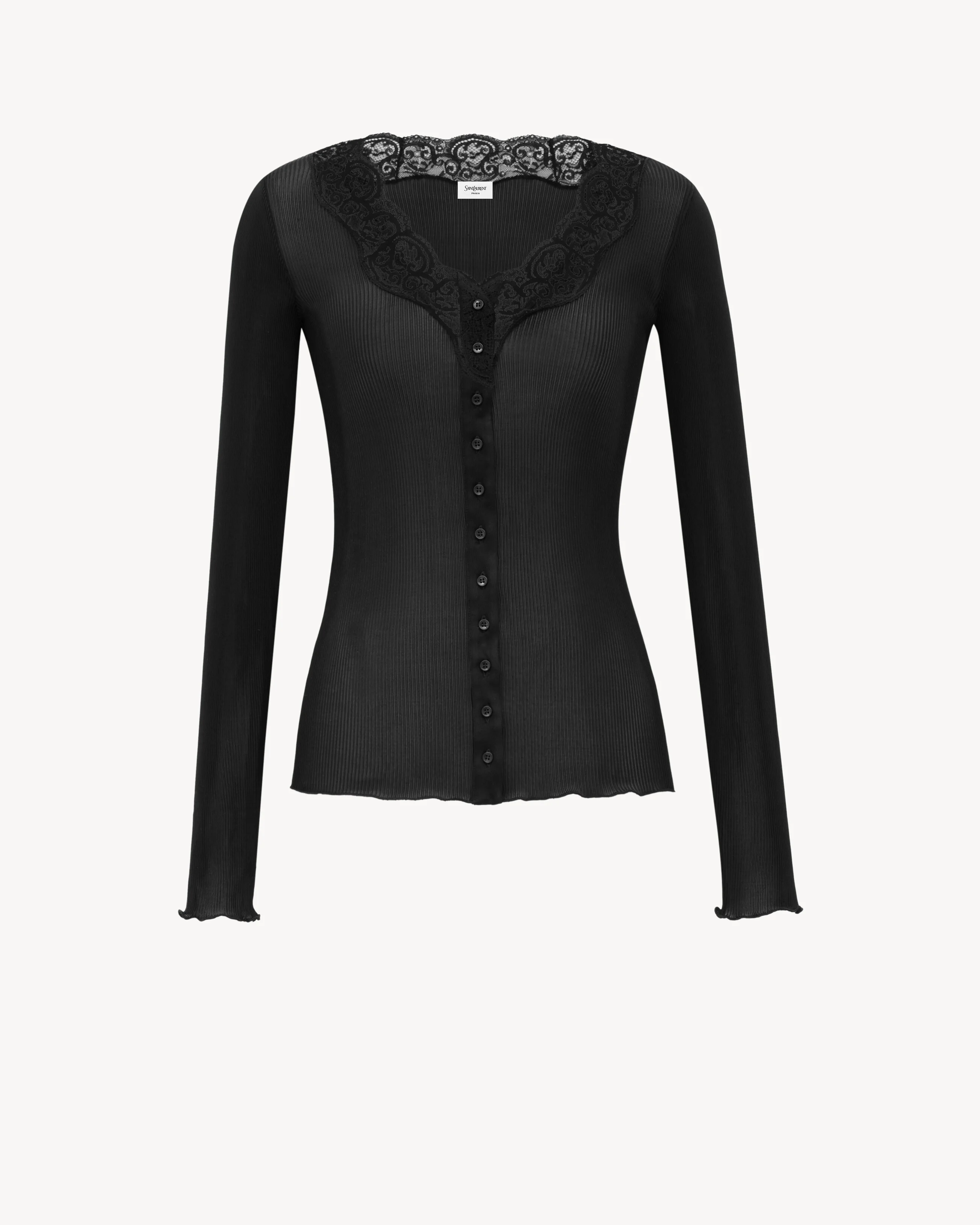 SEMI-SHEER FITTED BUTTONED CARDIGAN MADE WITH CERTIFIED SILK, FEATURING A ROUND SCALLOPED LACE DECOLLETE, LONG SLEEVES AND A FRILLED HEM AND CUFFS. - FRONT BUTTON CLOSURE - WIDE ROUND NECK - FRILLED HEM AND CUFFS - 100% SILK - STYLE ID 839144Y37SM1000 - MADE IN ITALY