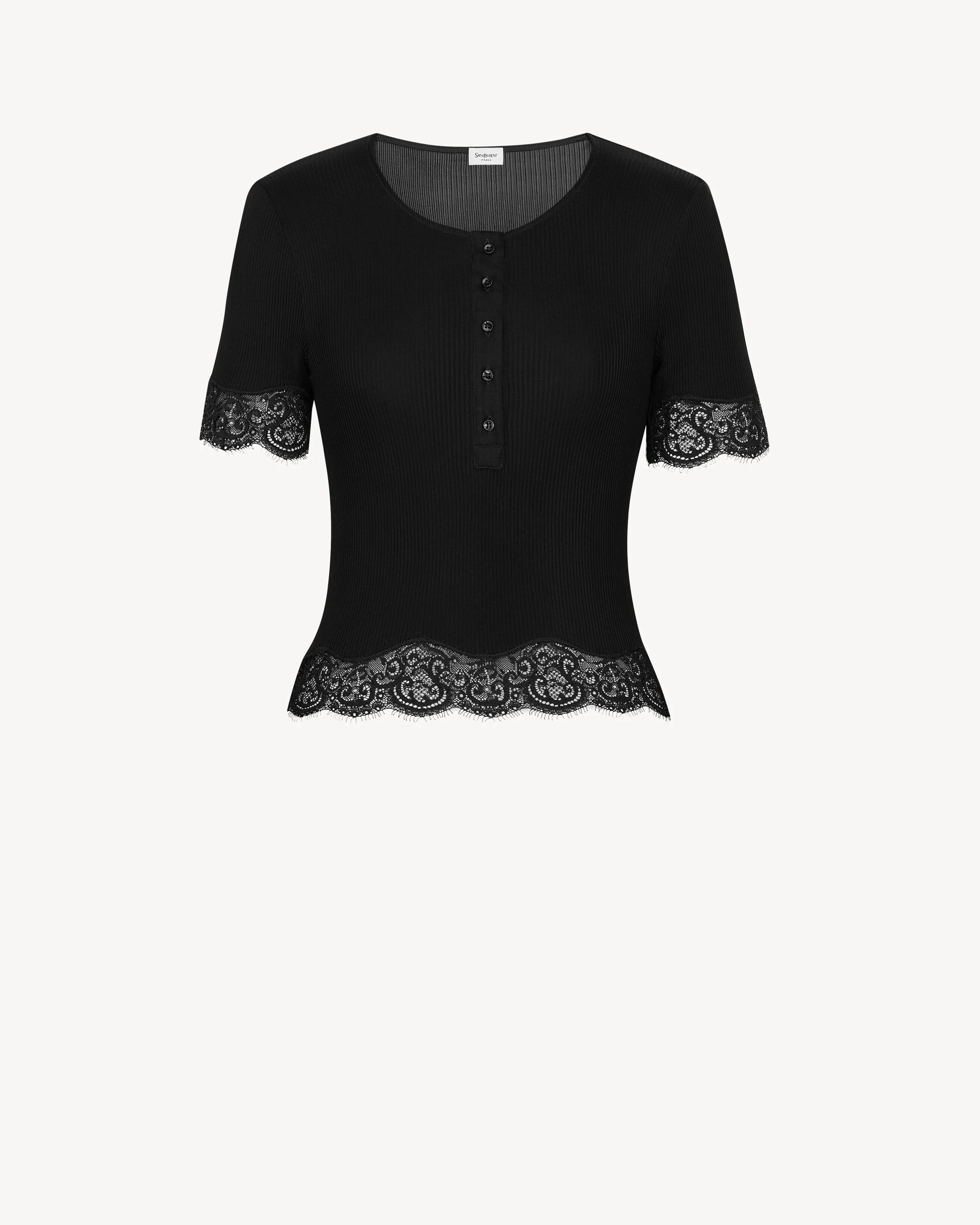 SEMI-SHEER FITTED T-SHIRT MADE WITH CERTIFIED SILK, FEATURING A ROUND HENLEY NECK WITH SCALLOPED LACE CUFFS AND HEM. - CERTIFIED SILK - ROUND NECK WITH FIVE-BUTTON HENLEY COLLAR - 100% SILK - STYLE ID 851263Y37SM1000 - MADE IN ITALY