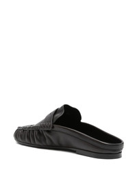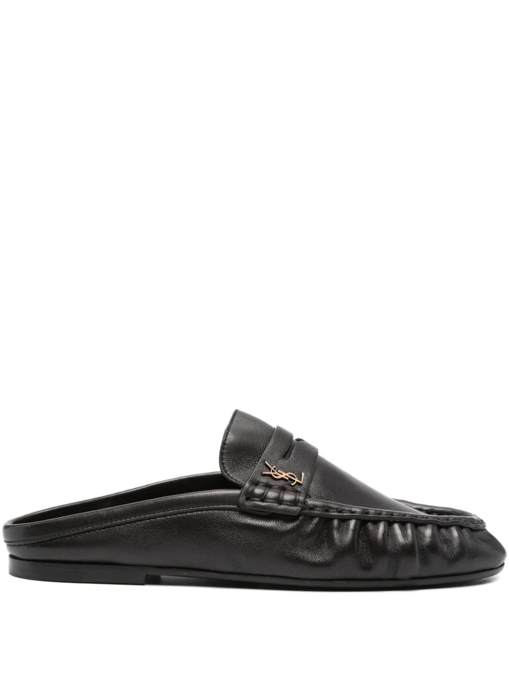 ruched logo mules Highlights - Dark brown - Gold-tone logo - Ruched detail - Slip-on style - Flat sole Made in Italy Composition Outer: Calf Leather 100% Lining: Calf Leather 100% Sole: Calf Leather 100%