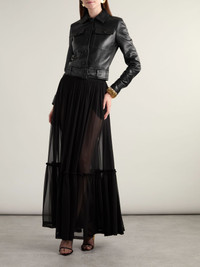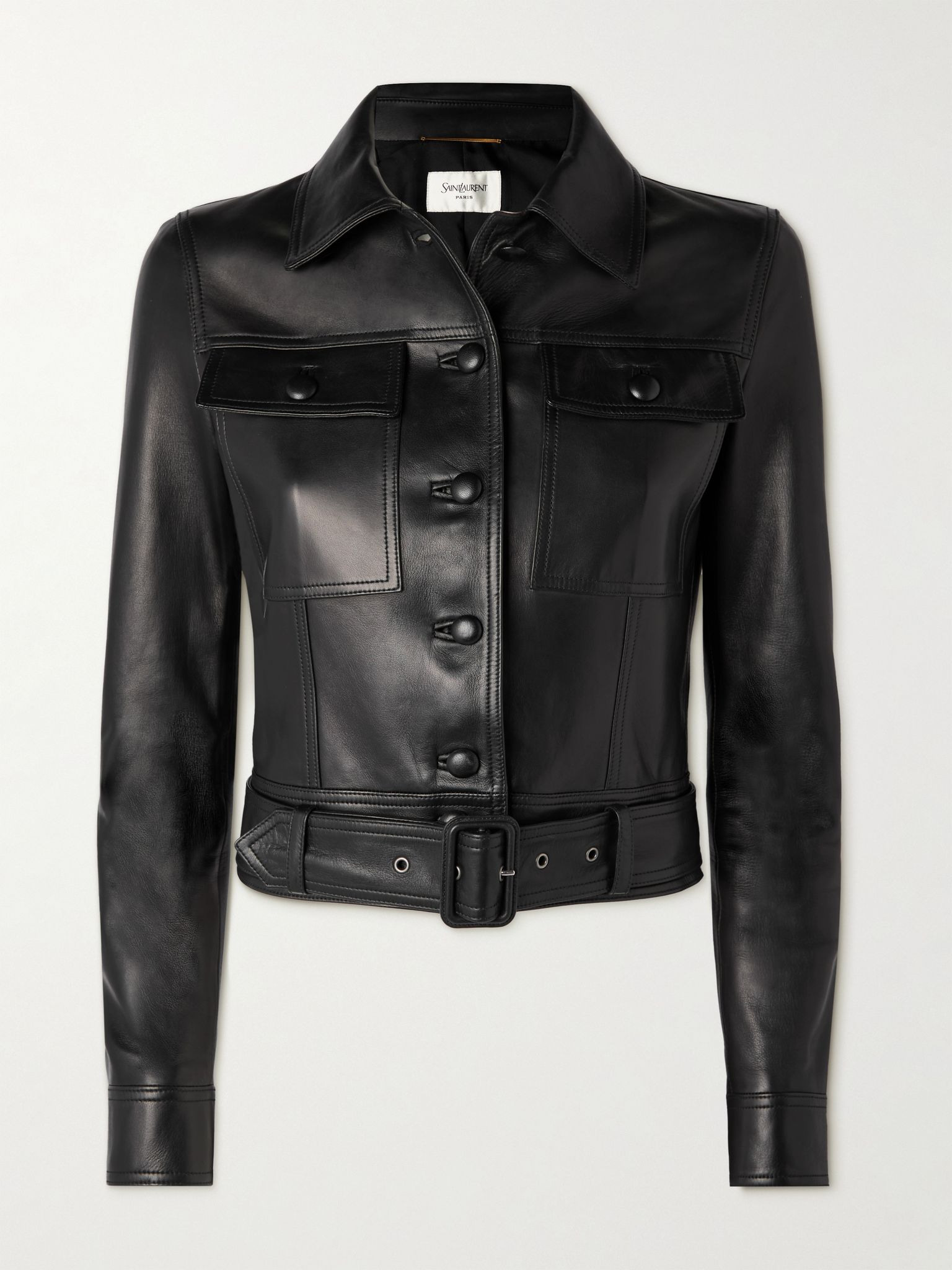 In recent seasons, SAINT LAURENT has been making some of the most sought-after leather jackets. This one demonstrates the label's mastery of the material, with strategic paneling and topstitching to contour the shape. It's fitted with a biker-style belt to define the slightly cropped hem. Size & Fit - Fits true to size, take your normal size - Designed for a slim fit - Supple, non-stretchy leather - Model is 177cm/ 5'10" and is wearing a FR 36 Model measurements: - Bust: 81cm/ 32” - Waist: 66cm/ 26” - Hip: 90cm/ 35.5” Details & Care - Black leather - Button fastenings through front - 100% leather (Lamb); lining: 100% silk
