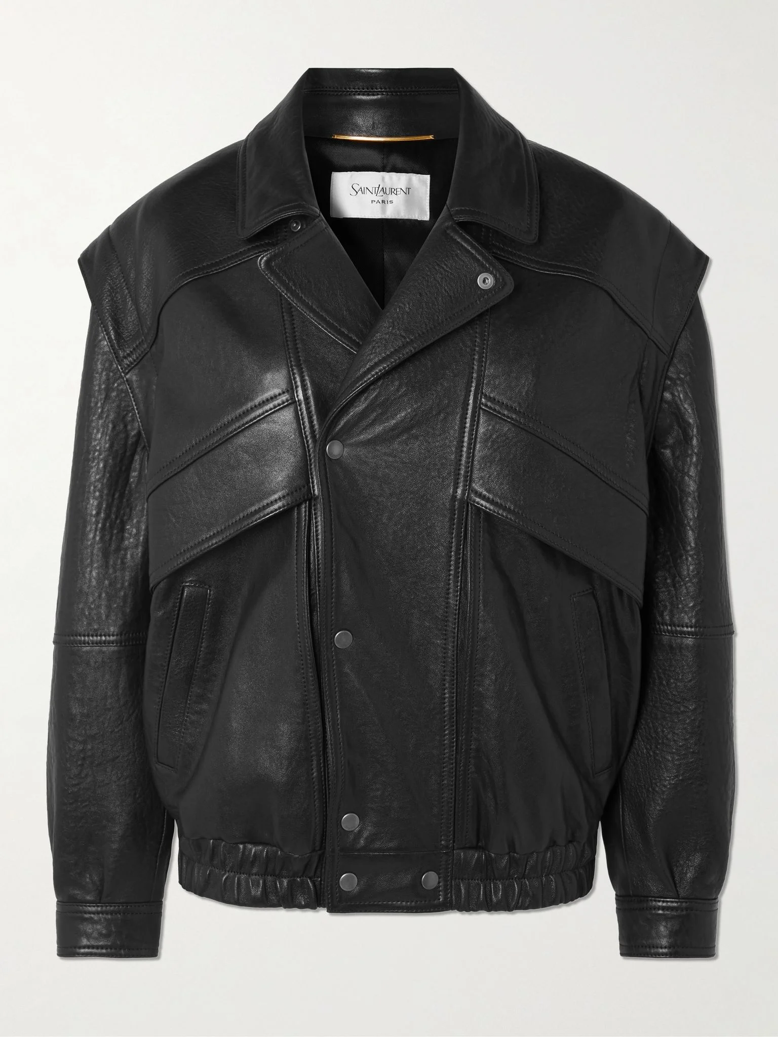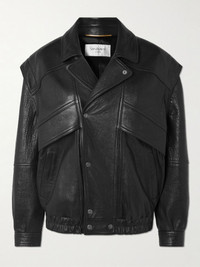 For Pre-Fall '25, SAINT LAURENT's Anthony Vaccarello references a number of stylish artists, like Francoise Hardy and Kurt Cobain. This jacket is cut from leather in an oversized shape with paneled armholes for a layered effect. It was worn in the lookbook with a croc-effect skirt and sheer stockings. Size & Fit - Fits true to size, take your normal size - Designed for a loose fit - Elasticated at the hem - Supple, non-stretchy leather - Model is 180cm/ 5'11" and is wearing a FR 36 Model measurements: - Bust: 79cm/ 31" - Waist: 60cm/ 23.5" - Hip: 86cm/ 34" Details & Care - Black leather - Snap fastenings - 100% leather (Lamb) - Specialist clean