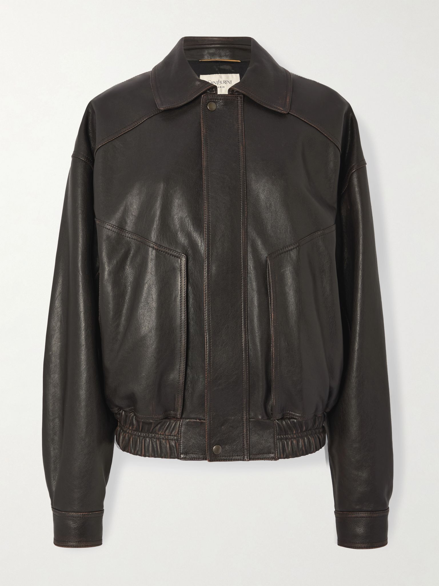 SAINT LAURENT's Spring '25 collection pays tribute to the house's founder with fresh reinterpretations of designs he would wear in the '80s. Debuted on the runway, this aviator-style jacket is made from supple leather in a loose shape with an elasticated hem and neat collar. You can style it just as easily with sharp tailoring or feminine dresses. Size & Fit - Fits true to size, take your normal size - Designed for a loose fit - Elasticated at the waist for a flexible fit - Supple, non-stretchy leather - Model is 175cm/ 5'9" and is wearing a FR 36 Model measurements: - Bust: 75cm/ 29.5” - Waist: 61cm/ 24" - Hip: 88cm/ 34.5" Details & Care - Black leather - Snap and concealed zip fastening through front - 100% leather (Lamb)