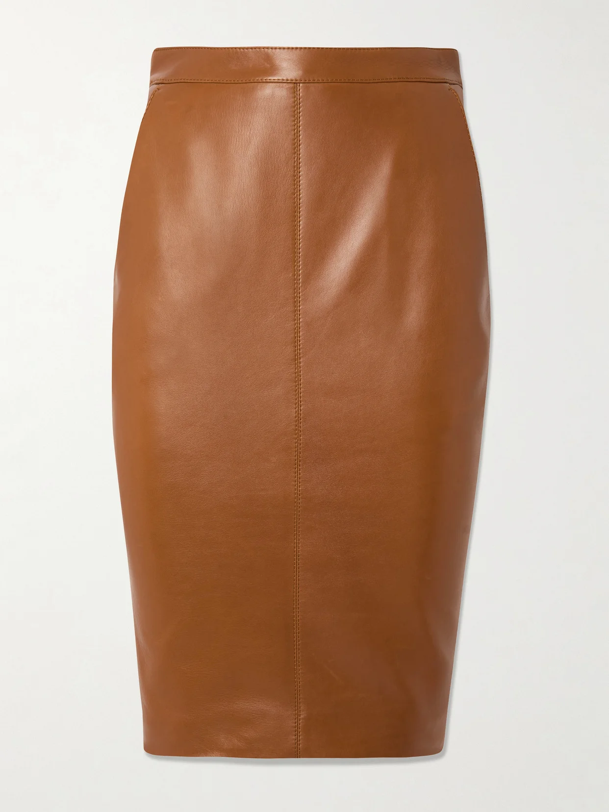 SAINT LAURENT's knee-length skirt is so effortlessly chic. Made from supple leather, it's designed with a high waist and clean, streamlined profile. Wear yours with a silk blouse or knitwear.
