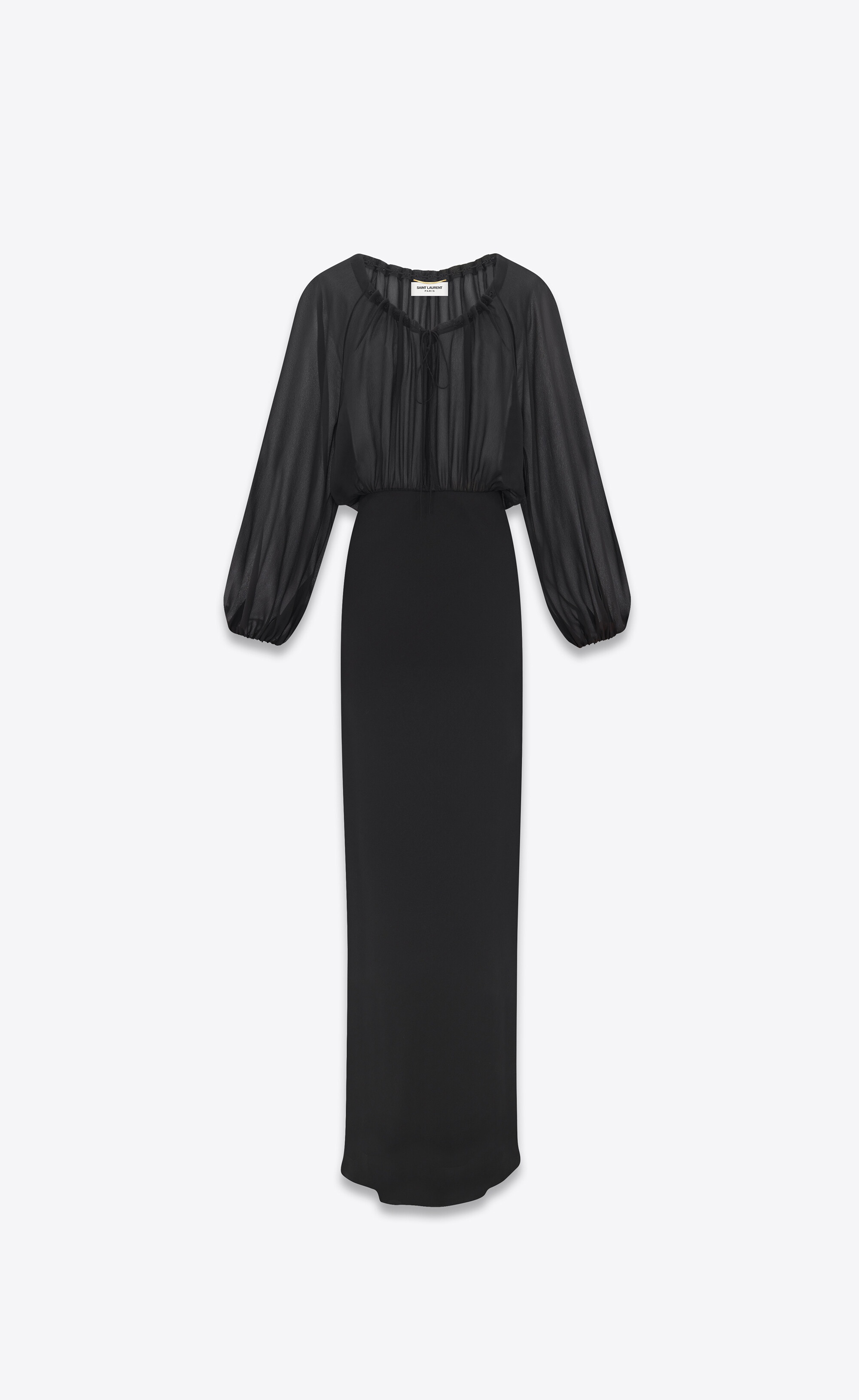 LONG DRESS MADE WITH ORGANIC SILK, WITH SEMI-SHEER BLOUSE FEATURING ADJUSTABLE TIES AT THE NEKLINE AND PUFFED SLEEVES. - 100% SILK - ORGANIC SILK - ZIP CLOSURE - NECK TIES - STYLE ID 729106Y059R1000 - MADE IN FRANCE