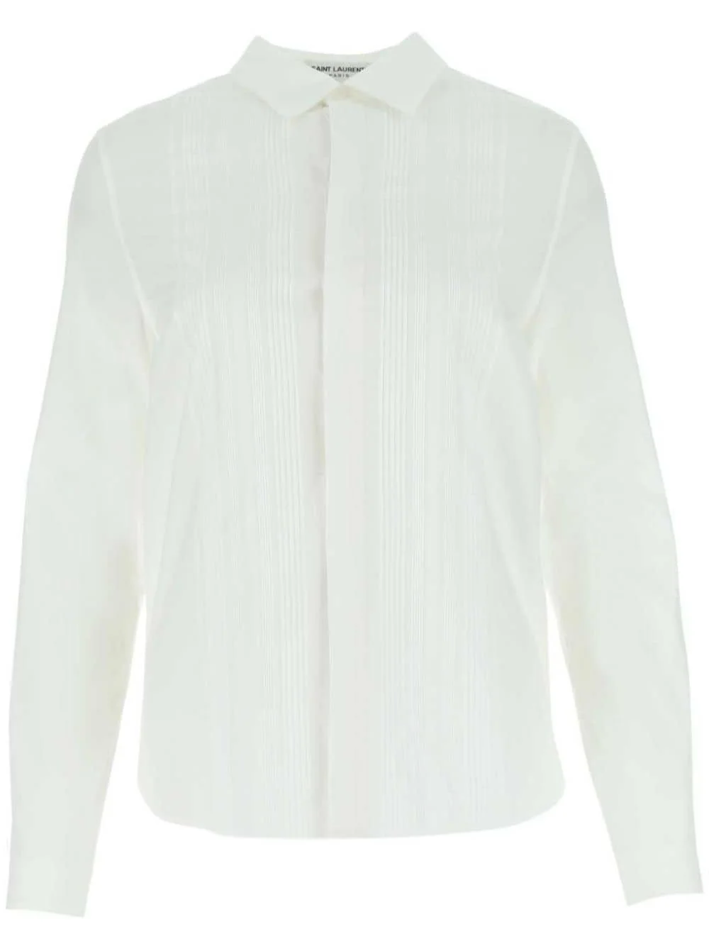 poplin shirt Saint Laurent presents a wardrobe staple with this design for AW22. Imagined in a fresh white hue, this long-sleeve shirt features a classic collar and a traditional front button fastening, reflecting a timeless style. Highlights - White - Poplin texture - Front button fastening - Long sleeves Made in Italy Composition Fabric 100% Outer: Cotton 100%
