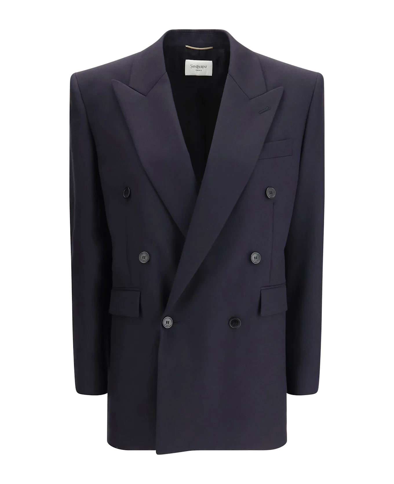 The long wool-gabardine blazer by saint laurent showcases the brand s tailored elegance through a strong, elongated silhouette. the double-breasted construction, structured shoulders and peaked lapels emphasise its refined presence, while the flap pockets and chest welt pocket introduce balanced detailing. buttoned cuffs and a double back vent complete a coat that embodies the timeless sophistication by saint laurent. Composition: 100% % Wool, 100% % Silk Made in: Italy Model number: 853433Y405W4141