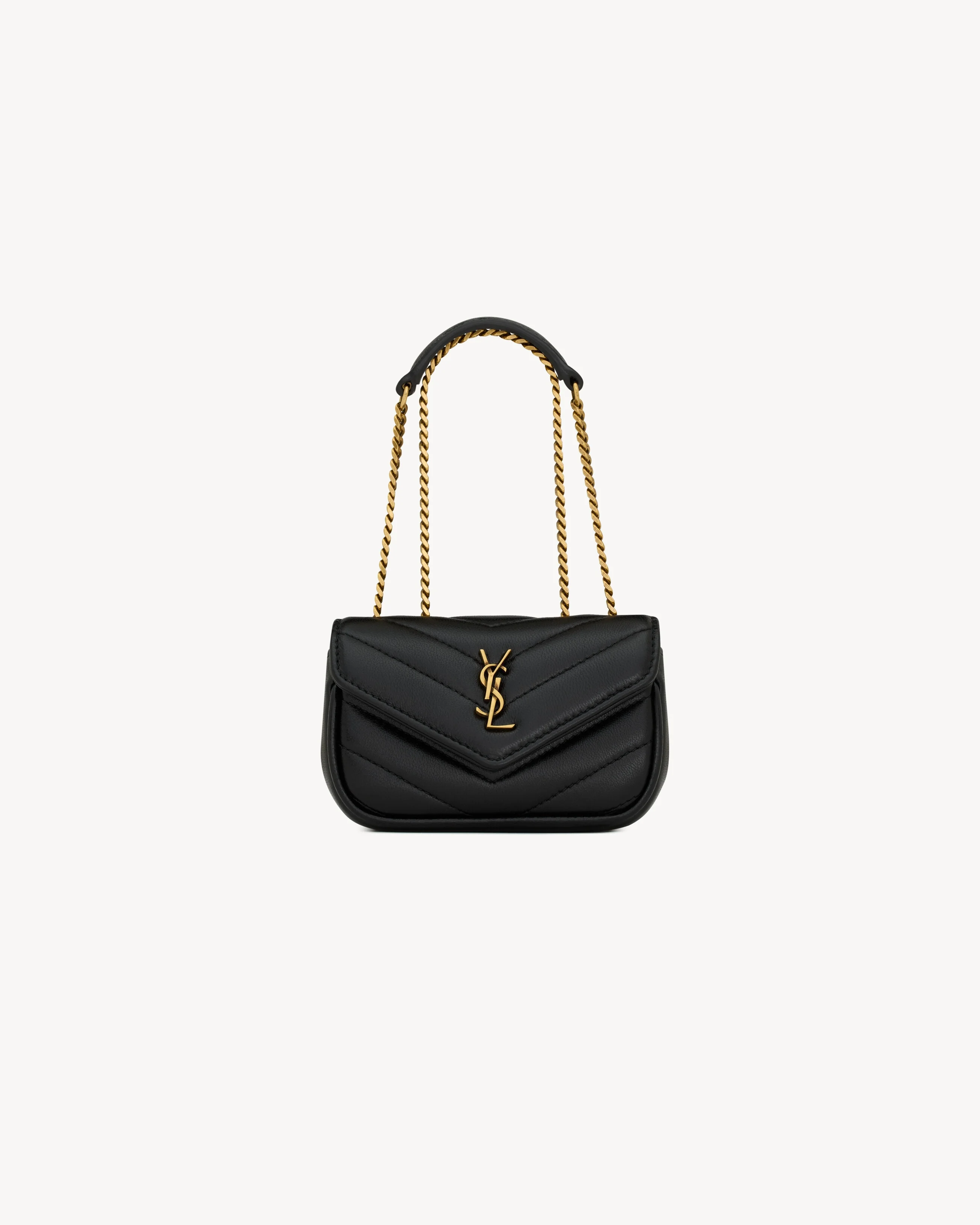 THE MICRO VERSION OF THE LOULOU, DECORATED WITH THE ICONIC CHEVRON-QUILTED TOPSTITCHING. FEATURING A SLIDING CHAIN STRAP, IT MAY BE CARRIED BY HAND OR ATTACHED TO A BAG. - LEATHER LINING - BRONZE-TONED HARDWARE - MAGNETIC SNAP CLOSURE - DIMENSIONS: 6.5 X 10.5 X 4 CM / 2.6" X 4.1" X 1.6" - HANDLE DROP: 18 CM / 7.1" - 70% LAMBSKIN 30% BRASS - STYLE ID 823962AAEAX1000 - MADE IN ITALY