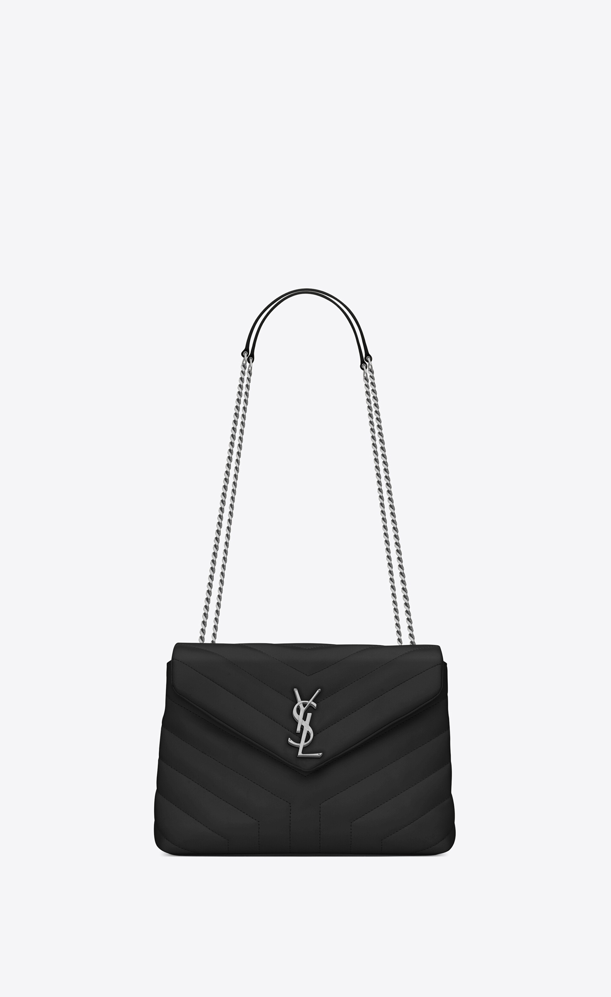 SAINT LAURENT MONOGRAM BAG WITH FRONT FLAP, FEATURING INTERLACED METAL YSL INITIALS, A LEATHER AND METAL CHAIN STRAP THAT CAN BE WORN DOUBLED ON THE SHOULDER AND Y-QUILTED OVERSTITCHING. - 100% CALFSKIN LEATHER - DIMENSIONS: 23 X 17 X 9 CM / 9.8 X 6.6 X 3.5 INCHES - SHOULDER STRAP DROP: FOLDED 30 CM / 11.8 INCHES, SIMPLE 56 CM / 22 INCHES - SILVER-TONED METAL HARDWARE - MAGNETIC SNAP CLOSURE - INTERIOR: TWO MAIN COMPARTMENTS, ONE ZIP COMPARTMENT, ONE FLAT POCKET - GROSGRAIN LINING - STYLE ID 807899831 - MADE IN ITALY