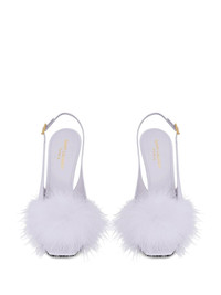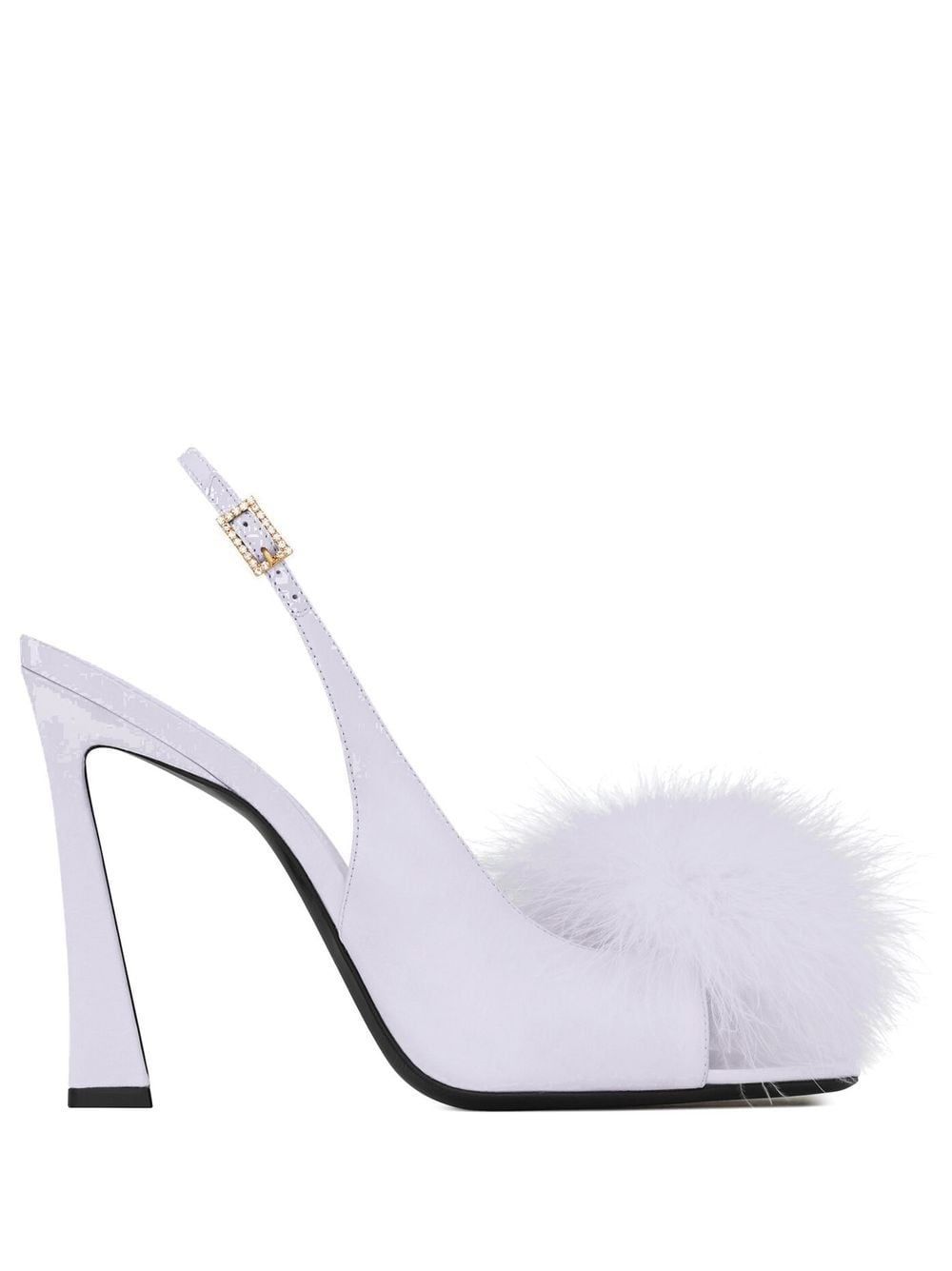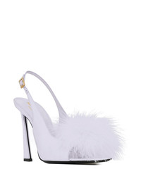 faux-fur detail 110mm sandals faux-fur detail 110mm sandals from SAINT LAURENT featuring faux-fur trim, buckle-fastening slingback strap, open toe, high heel, branded insole, white and leather/silk. Made in Italy Composition Sole: Leather 100% Outer: Silk 100% Lining: Fabric 100%