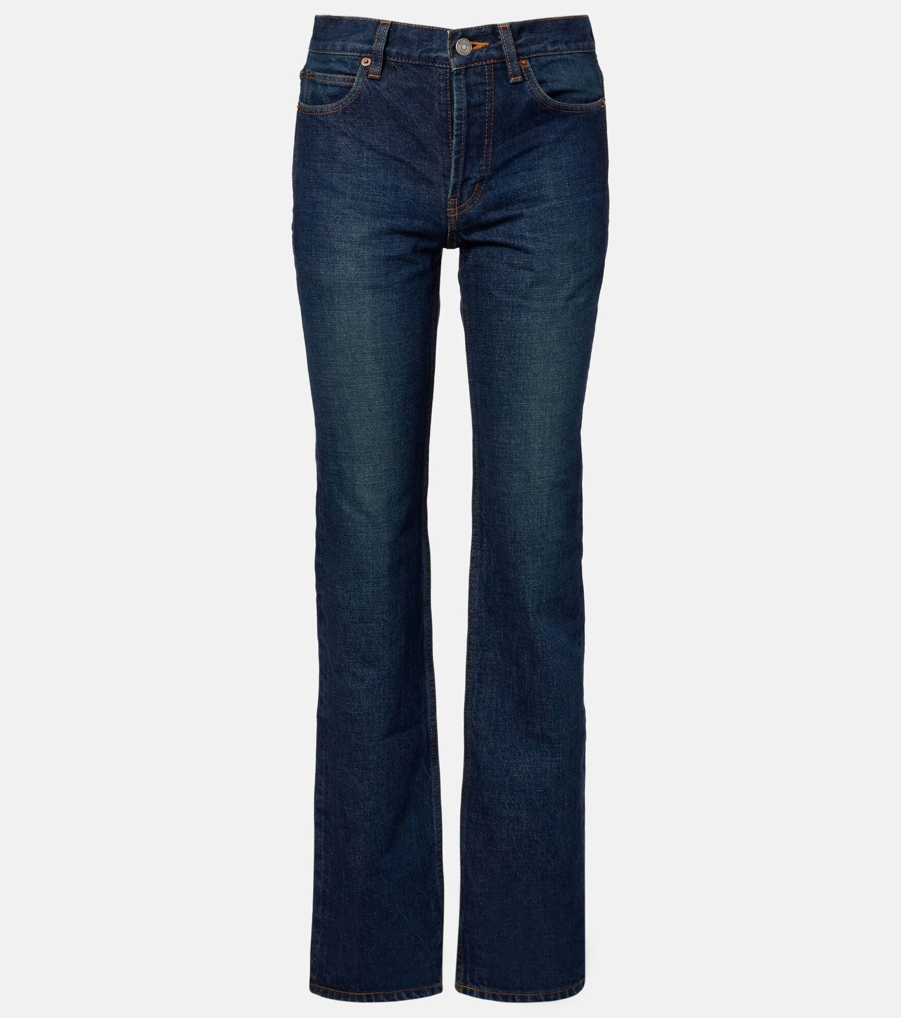 These Saint Laurent bootcut jeans create the perfect vintage look that channels an early 2000s aesthetic. The design features a mid-rise waistline and a light-washed finish. Product Details - Material: 100% cotton - Care instructions: machine wash at 30 degrees - Made in Japan - Designer color name: Heritage Indigo - Item color: blue - Details: 100% calf leather - Contains non-textile parts of animal origin - Closure: concealed button placket - Belt loops - Pockets: five pockets - Item number: P01086641 Size & Fit - Fits small to size - we recommend trying one size larger - Non-stretchy fabric - Bootcut - Mid-rise - The model seen in the picture is 178cm-5'10" and wearing a size 27