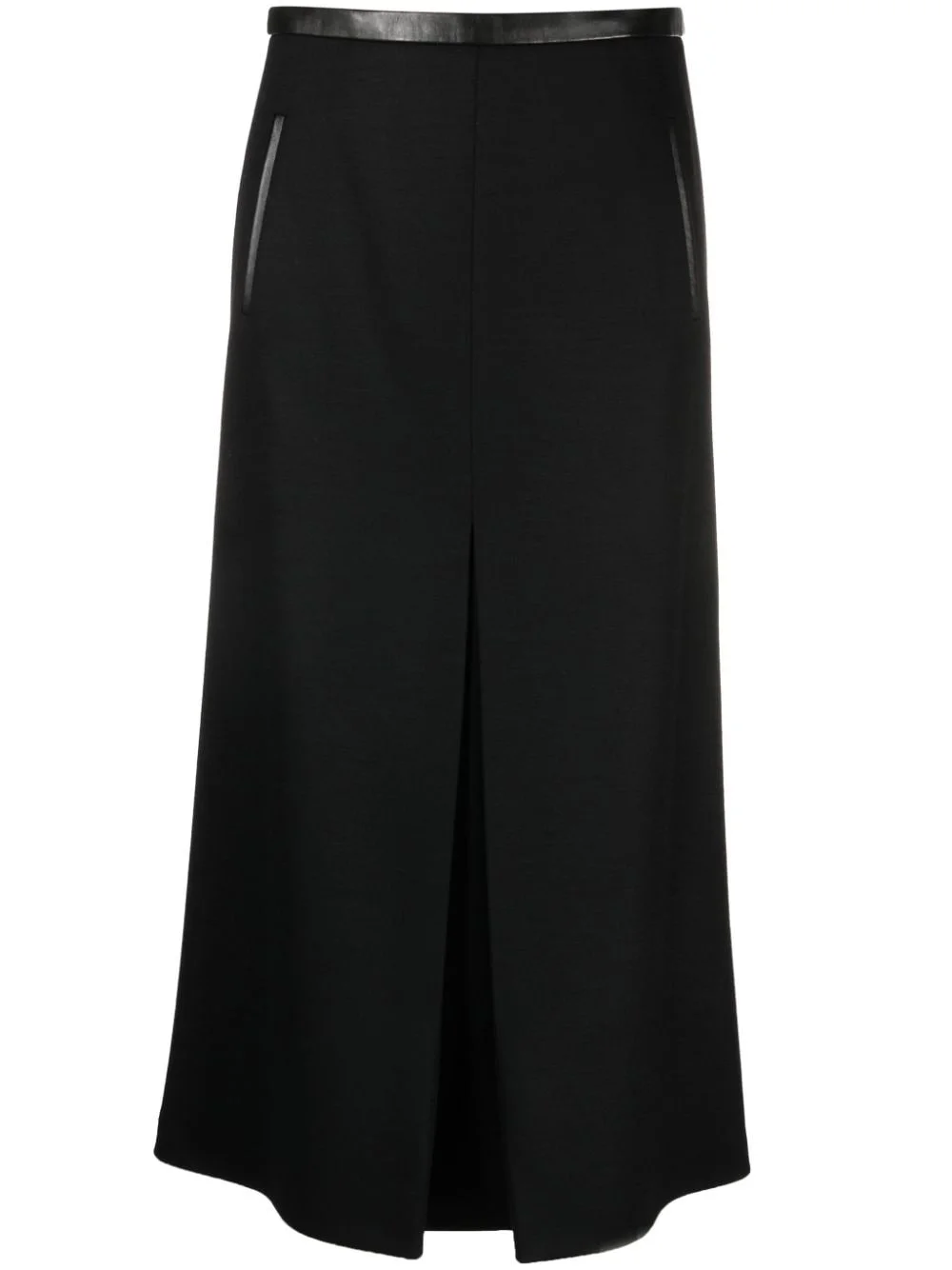 pleat-detail wool-blend midi skirt Highlights - Black - Wool blend - Leather trim - High-waisted - Pleat detailing - Rear zip fastening - Two side slit pockets - Slight flare - Below-knee length - Straight hem Made in Italy Composition Outer: Lamb Skin 100%, Wool 98%, Polyamide 2% Lining: Silk 100% SIZE & FIT Model measurements Height 5 ft 10 in(1.77 m) Bust/Chest 31.1 in(79 cm) Hips 35.03 in(89 cm) Waist 23.62 in(60 cm) Measurement HIPS 37.79 in(96 cm) LENGTH 31.1 in(79 cm) WAIST 28.34 in(72 cm) FittingInformation This midi-length skirt is intended to be worn high on the waist Made from a midweight non-stretch fabric, this piece offers minimal elasticity when worn This piece fits true to size – take your usual size Washing instructions Dry Clean Only