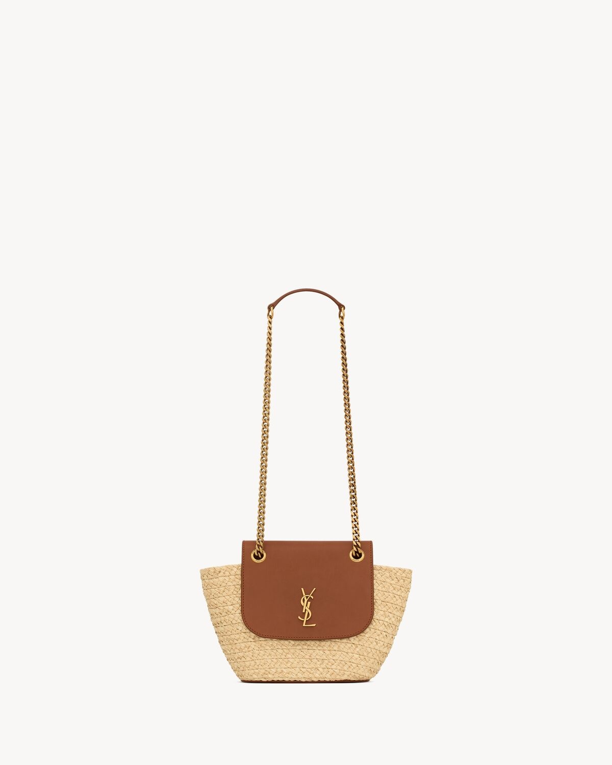 MINI BASKET BAG IN WOVEN RAFFIA WITH A FLAP IN METAL-FREE TANNED LEATHER DECORATED WITH THE CASSANDRE. FEATURING A SLIDING CHAIN STRAP, THE BAG MAY BE WORN ON THE SHOULDER OR CROSSBODY. - METAL-FREE, CHROME-FREE TANNED LEATHER - BRONZE-TONED HARDWARE - MAGNETIC FLAP CLOSURE - ONE MAIN COMPARTMENT - ONE FLAT POCKET - DIMENSIONS: 23 X 12 X 6 CM / 9.1" X 4.7" X 2.4" - STRAP DROP: 27–52 CM / 10.6–20.5" - RAFFIA, CALFSKIN LEATHER, BRASS - STYLE ID 774269GAAED9051 - MADE IN MADAGASCAR