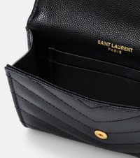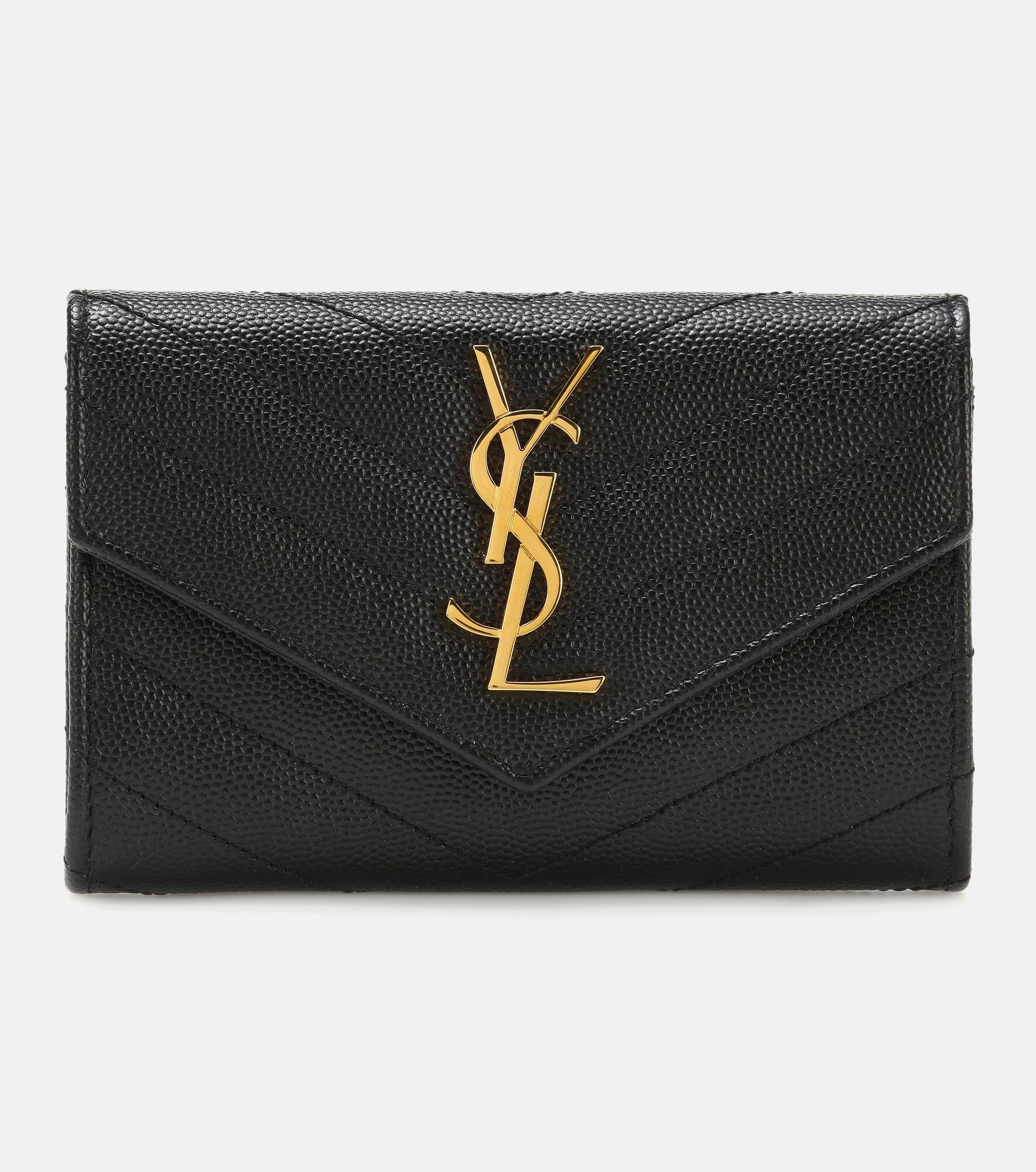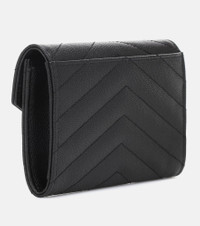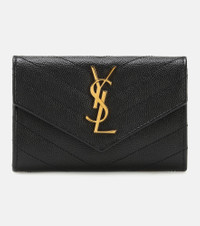 Approach mid-day coffee dates in style while holding Saint Laurent's Monogram Small wallet in hand. Crafted from grainy leather and with a matelassé quilted finish, this flap-over style comes emblazoned with the label's signature YSL monogram in golden hardware for instant recognition. Product Details - Color of fastening: gold - Made in Italy - Designer color name: Nero - Internal details: internal slot pockets, leather lining, Card slots - Material: calf leather - Closure: snap-clasp fastening - Back slot pocket - Item number: P00263673 Size & Fit - Height 9cm-3.5" - Width 13cm-5" - Depth 2cm-1"