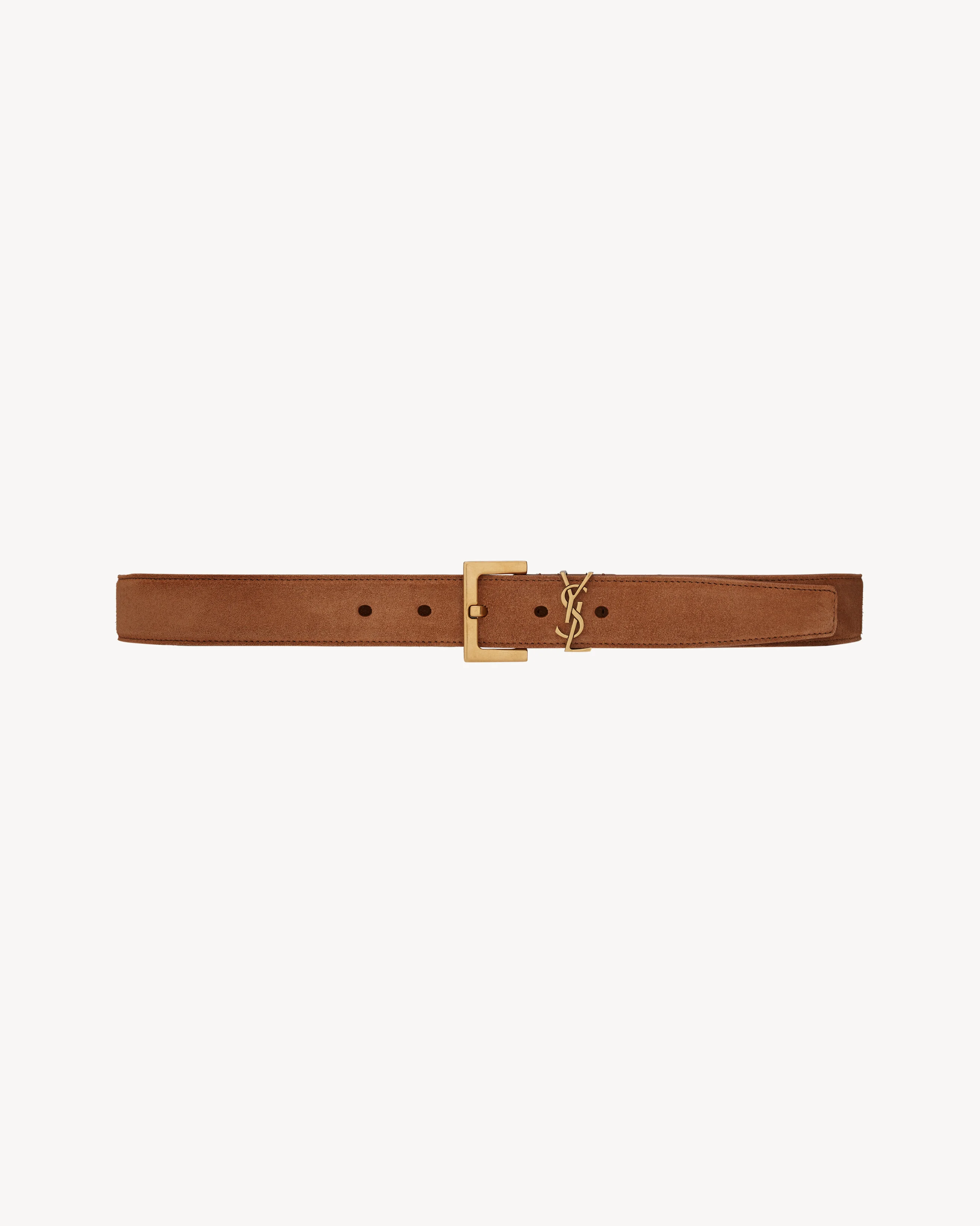 BELT WITH ADJUSTABLE SQUARE BUCKLE FEATURING A METAL YSL MONOGRAM LOOP. - 100% CALFSKIN LEATHER - WIDTH: 3 CM / 1.2 INCHES - BRONZE-TONED METAL HARDWARE - ADJUSTABLE BUCKLE FASTENING - STYLE ID 634437C0X0W6309 - MADE IN ITALY