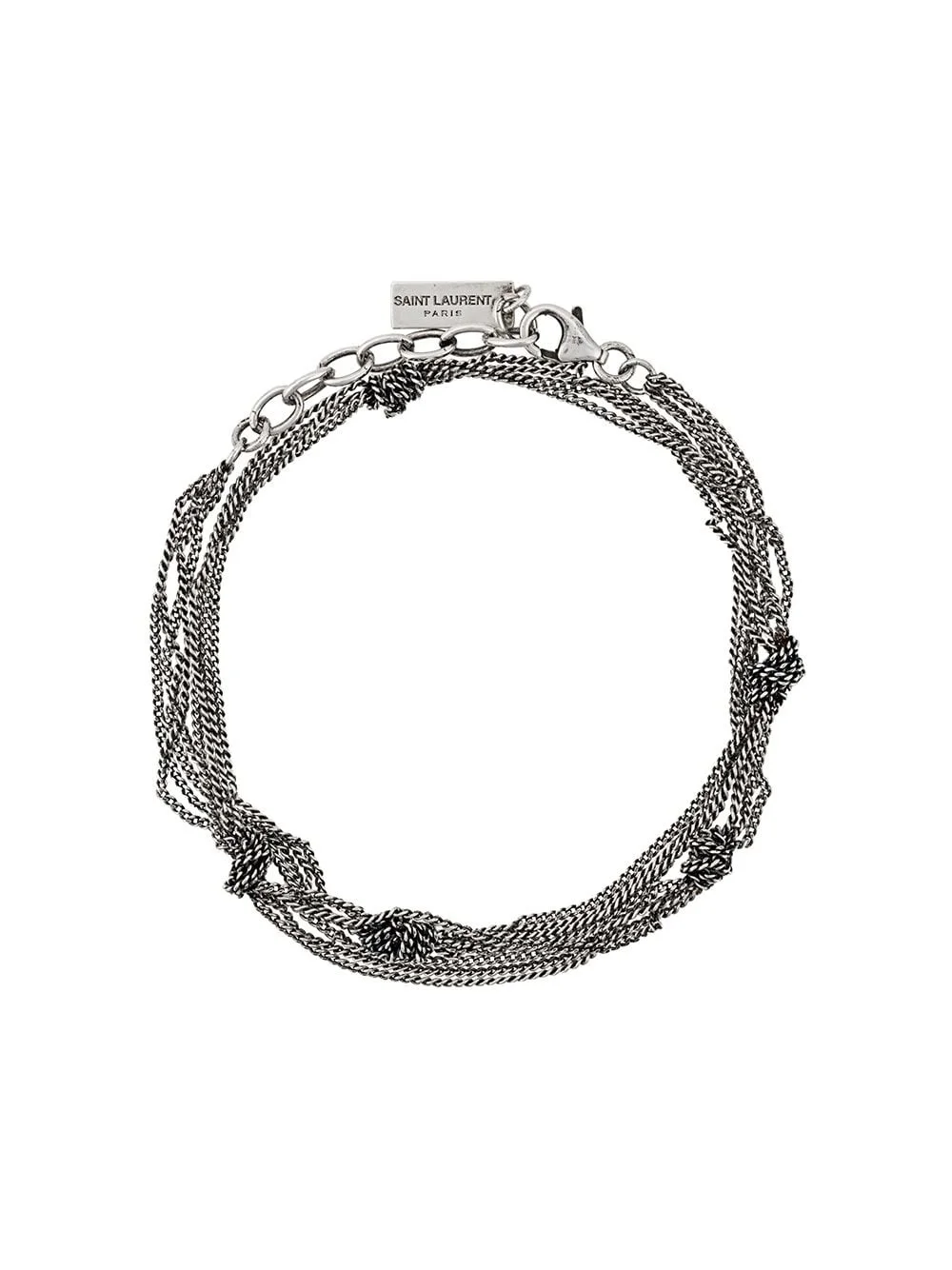 multi-chain knot bracelet Founded in 1961 by innovative designer Yves Saint Laurent, French luxury fashion house Saint Laurent fuses expert craftsmanship with the label’s signature rock ’n’ roll flair. This silver-tone brass multi-chain knot bracelet from Saint Laurent features a lobster claw fastening, an engraved logo charm and knotted details. Made in Italy SIZE & FIT Measurement WIDTH 0.19 in(0.5 cm) TOTAL LENGTH 13.77 in(35 cm) Minimum Length 12.59 in(32 cm)
