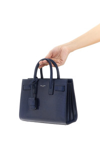 cod. 398711EABCT4135 Dwarf 'Sac De Jour' lizard leather handbag with front embossed logo, side gussets with straps, double fixed tubular handle, rigid base with metal feet, removable metal padlock detail, adjustable and removable shoulder strap. Color: Blue Size & Fit: W 22 x H 20.5 x D 12.5 cm Composition: 100% lizard Made in: Italy PROMO CODE NOT APPLICABLE