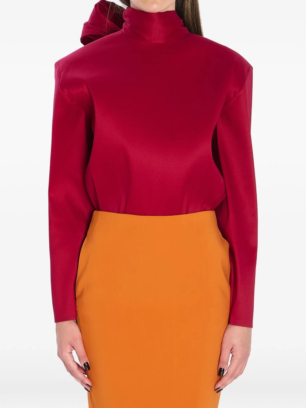 tie long-sleeve top Highlights - Red - Silk blend - Stand collar - Lavalliere tie - Structured shoulders - Concealed back zip closure Made in Italy Composition Silk 56%, Polyamide 29%, Spandex/Elastane 15% Washing instructions Read Manufacturer Guidelines