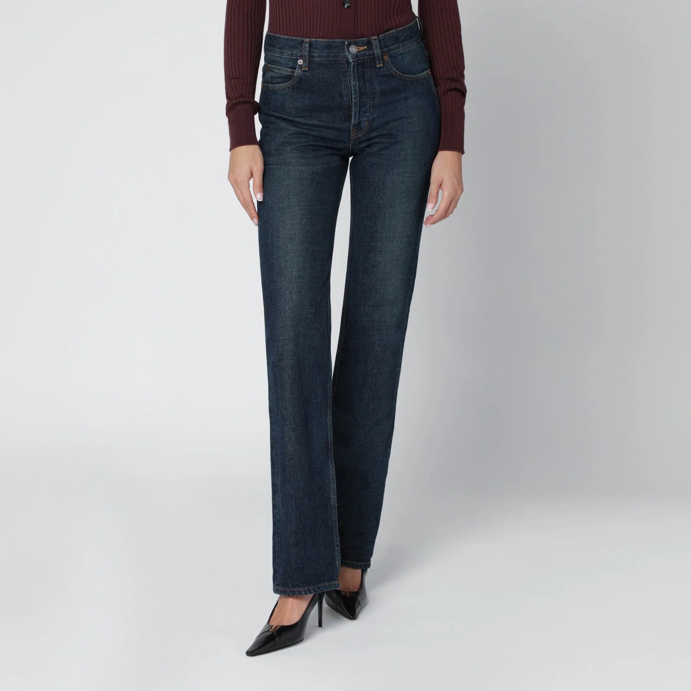 Saint Laurent jeans in Heritage indigo cotton denim featuring five classic pockets low-rise waist with belt loops straight leg button closure with button fly visible stitching and back logo patch.