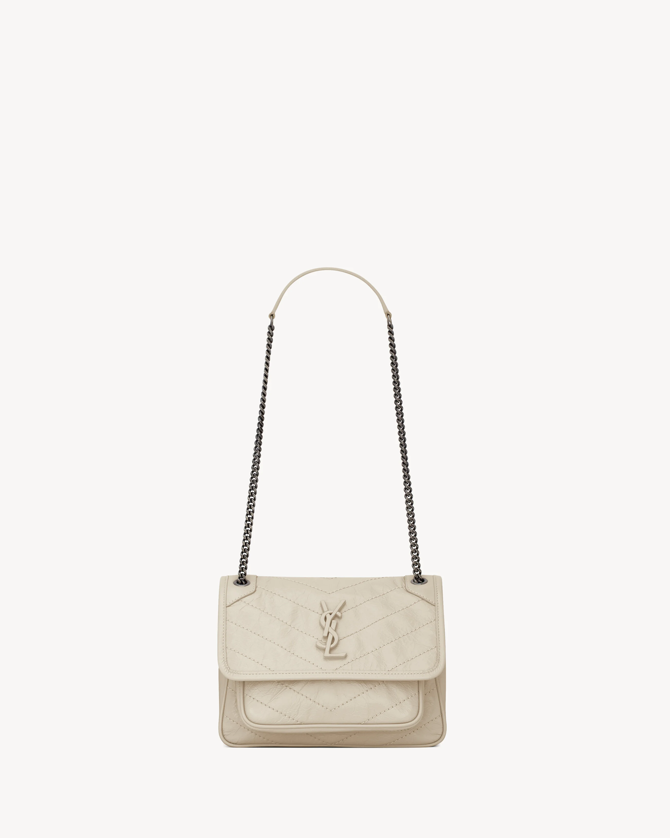 FLAP BAG IN VINTAGE CALF LEATHER, FEATURING CHEVRON QUILT OVERSTITCHING AND LEATHER-ENCASED CASSANDRE. LIGHT, WITH TWO COMPARTMENTS AND A LARGE BACK SLOT POCKET. FEATURES A SLIDING CHAIN STRAP THAT CAN BE WORN ON THE SHOULDER OR CROSSBODY. - CHROME AND METAL-FREE TANNED LEATHER - ORGANIC COTTON LINING - BRUSHED PALLADIUM HARDWARE - ONE EXTERIOR BACK POCKET - MAGNETIC SNAP TAB - TWO INTERIOR POCKETS - DIMENSIONS: 21 X 16 X 7,5 CM / 8.2 X 6.2 X 2.9 INCHES - CHAIN LENGHT: 30 - 57 CM / 11.8" - 22.4" - CALFSKIN, BRASS - STYLE ID 6331600EN049207 - MADE IN ITALY