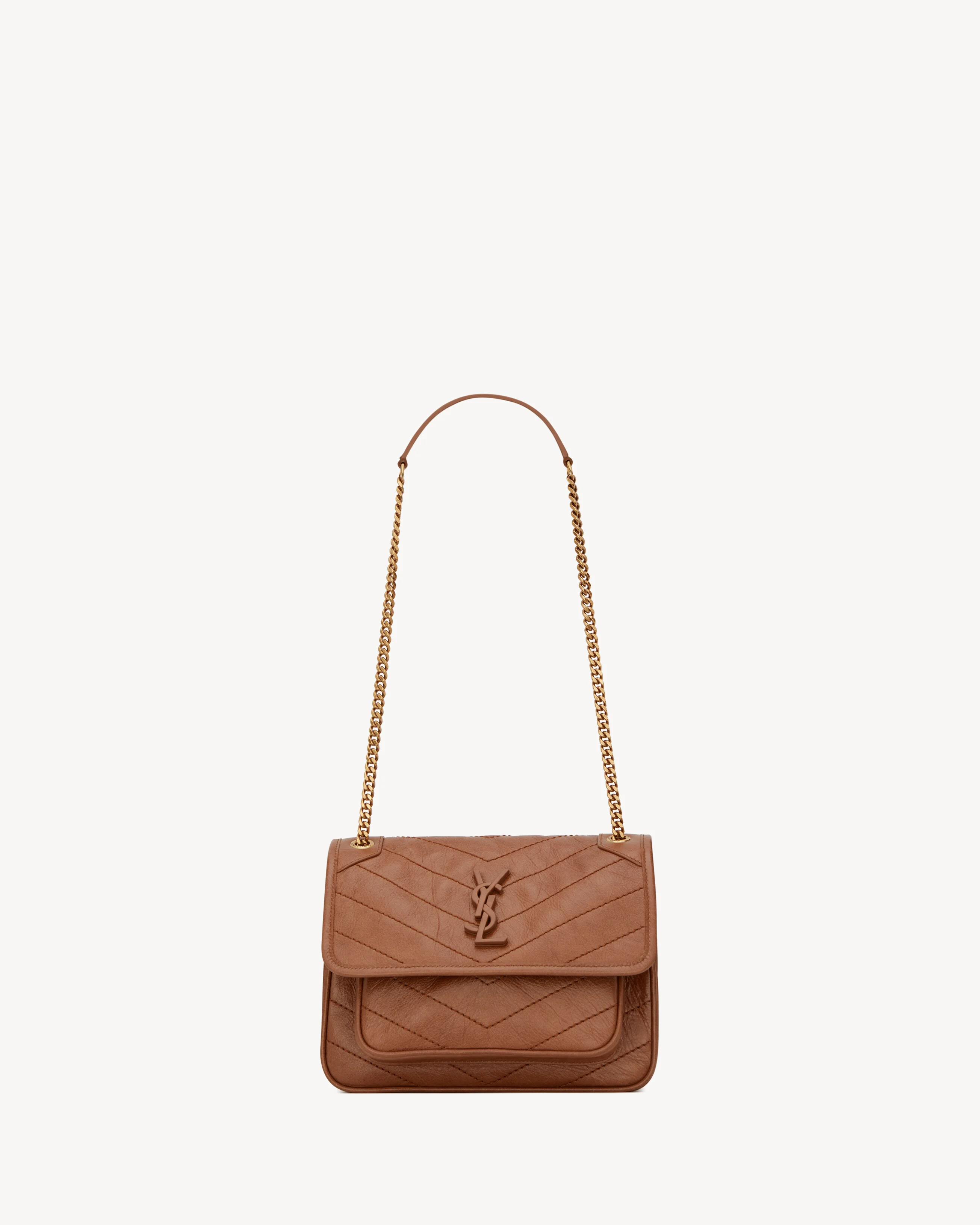 FLAP BAG IN VINTAGE CALF LEATHER, FEATURING CHEVRON QUILT OVERSTITCHING AND LEATHER-ENCASED CASSANDRE. LIGHT, WITH TWO COMPARTMENTS AND A LARGE BACK SLOT POCKET. FEATURES A SLIDING CHAIN STRAP THAT CAN BE WORN ON THE SHOULDER OR CROSSBODY. - GROSGRAIN LINING - LIGHT BRONZE BRASS HARDWARE - ONE EXTERIOR BACK POCKET - MAGNETIC SNAP TAB - TWO INTERIOR POCKETS - DIMENSIONS: 21 X 16 X 7,5 CM / 8.2 X 6.2 X 2.9 INCHES - CHAIN LENGHT: 30 - 57 CM / 11.8" - 22.4" - CALFSKIN LEATHER - STYLE ID 6331601YG072522 - MADE IN ITALY
