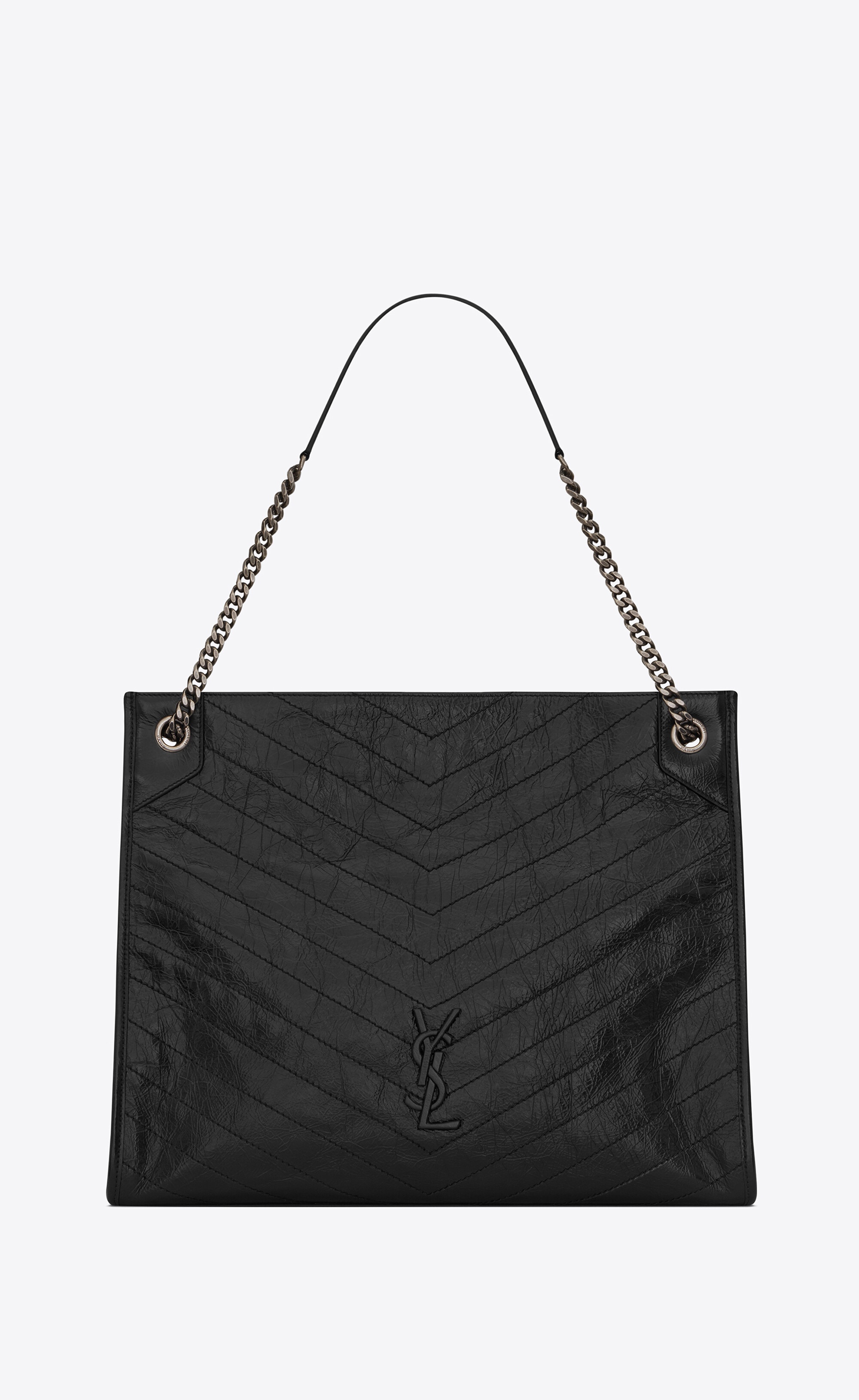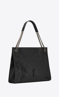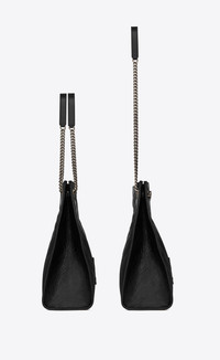 SAINT LAURENT MONOGRAM TOTE DECORATED WITH LEATHER-COVERED YSL INITIALS AND QUILTED OVERSTITCHING, FEATURING LEATHER-REINFORCED CHAIN HANDLES. - 100% CALFSKIN LEATHER - DIMENSIONS: 39 X 31,5 X 12,5 CM - SILVER-TONED METAL HARDWARE - GROSGRAIN LINING - MAGNETIC SNAP BUTTON FASTENING - ONE INSIDE ZIPPERED POCKET, ONE OPEN POCKET - HANDLE DROP: 24 CM - STRAP DROP: 42 CM - STYLE ID 808881655 - MADE IN ITALY