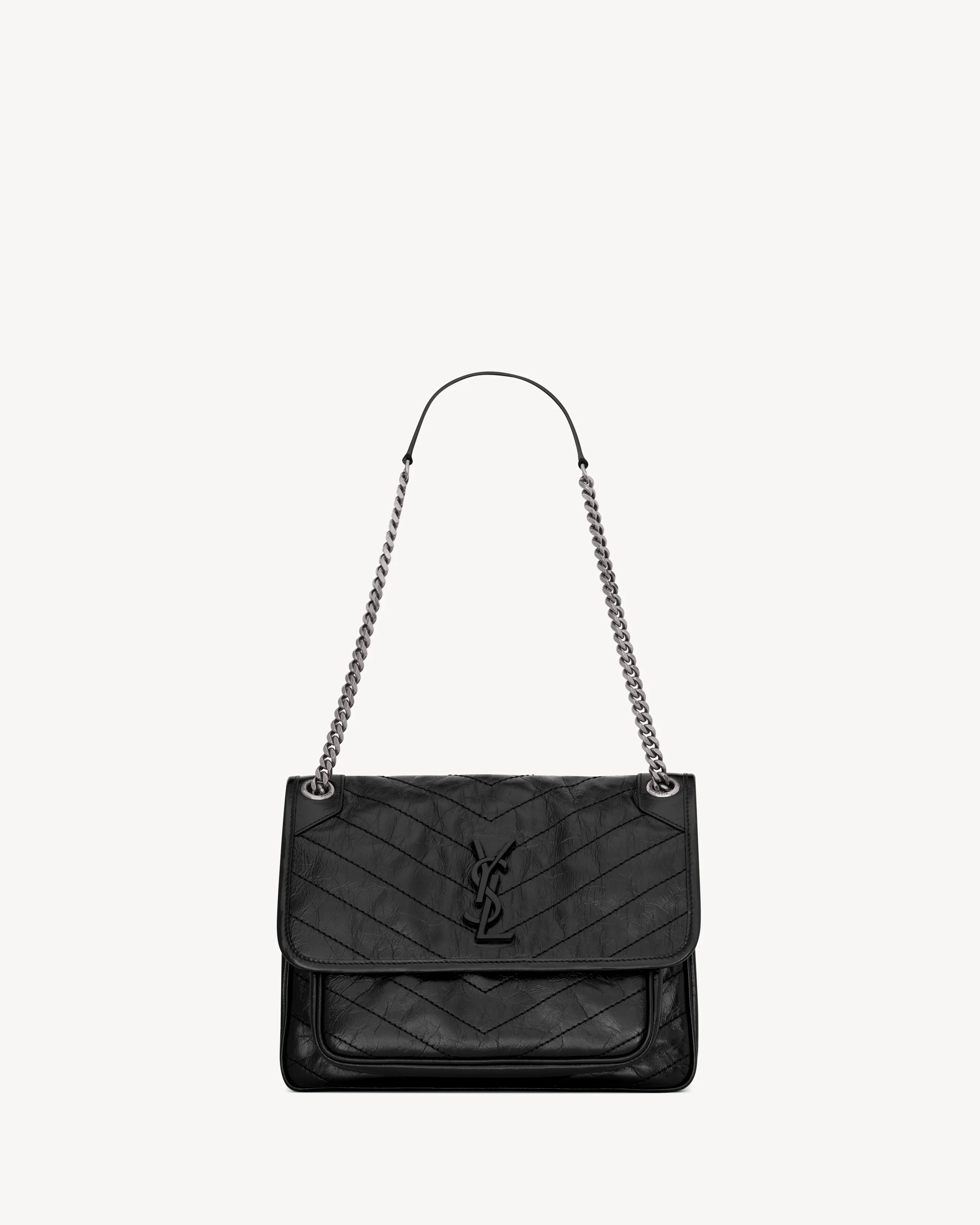 SOFT BAG IN VINTAGE CALF LEATHER, FEATURING CHEVRON QUILT OVERSTITCHING AND LEATHER-ENCASED CASSANDRE. SPACIOUS, WITH TWO COMPARTMENTS AND A LARGE BACK SLOT POCKET. FEATURES A SLIDING CHAIN STRAP THAT CAN BE WORN ON THE SHOULDER OR CROSSBODY. - CHROME AND METAL-FREE TANNED LEATHER - ORGANIC COTTON LINING - BRUSHED PALLADIUM HARDWARE - ONE EXTERIOR BACK POCKET - MAGNETIC SNAP TAB - TWO INTERIOR POCKETS - DIMENSIONS: 11 X 7.8 X 3.3 INCHES - CHAIN LENGTH: 11.8 TO 20.8 INCHES - CALFSKIN LEATHER, METAL - STYLE ID 6331580EN041000 - MADE IN ITALY