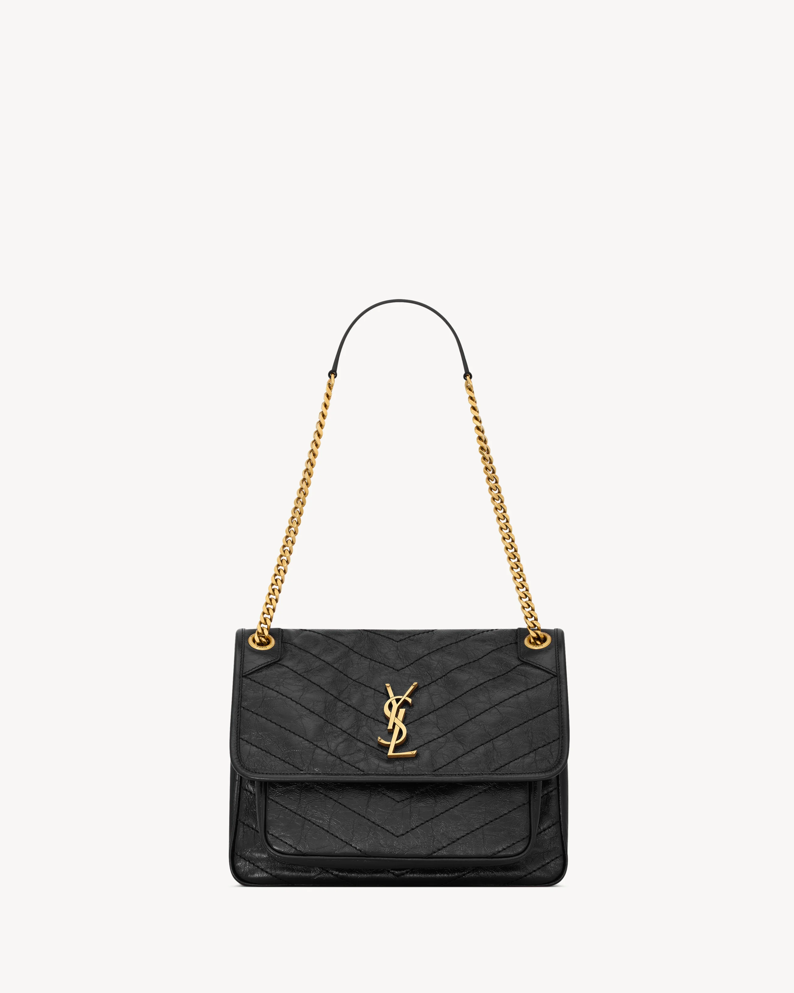 SOFT BAG IN VINTAGE LEATHER, DECORATED WITH THE CASSANDRE AND CHEVRON-QUILTED TOPSTITCHING. THIS SPACIOUS BAG FEATURES TWO COMPARTMENTS AND A LARGE FLAT POCKET AT THE BACK. A SLIDING LEATHER-AND-CHAIN STRAP ALLOWS FOR BOTH SHOULDER AND CROSSBODY CARRY. - COTTON LINING - BRONZE-TONE HARDWARE - MAGNETIC SNAP CLOSURE - ONE BACK POCKET - ONE OPEN POCKET UNDER FLAP - DIMENSIONS: 28 X 20 X 8.5 CM / 11" X 7.9" X 3.3" - SINGLE-STRAP DROP: 50 CM / 19.7" - DOUBLE-STRAP DROP: 28 CM / 11" - CALFSKIN LEATHER, METAL - STYLE ID 6331840EN071000 - MADE IN ITALY