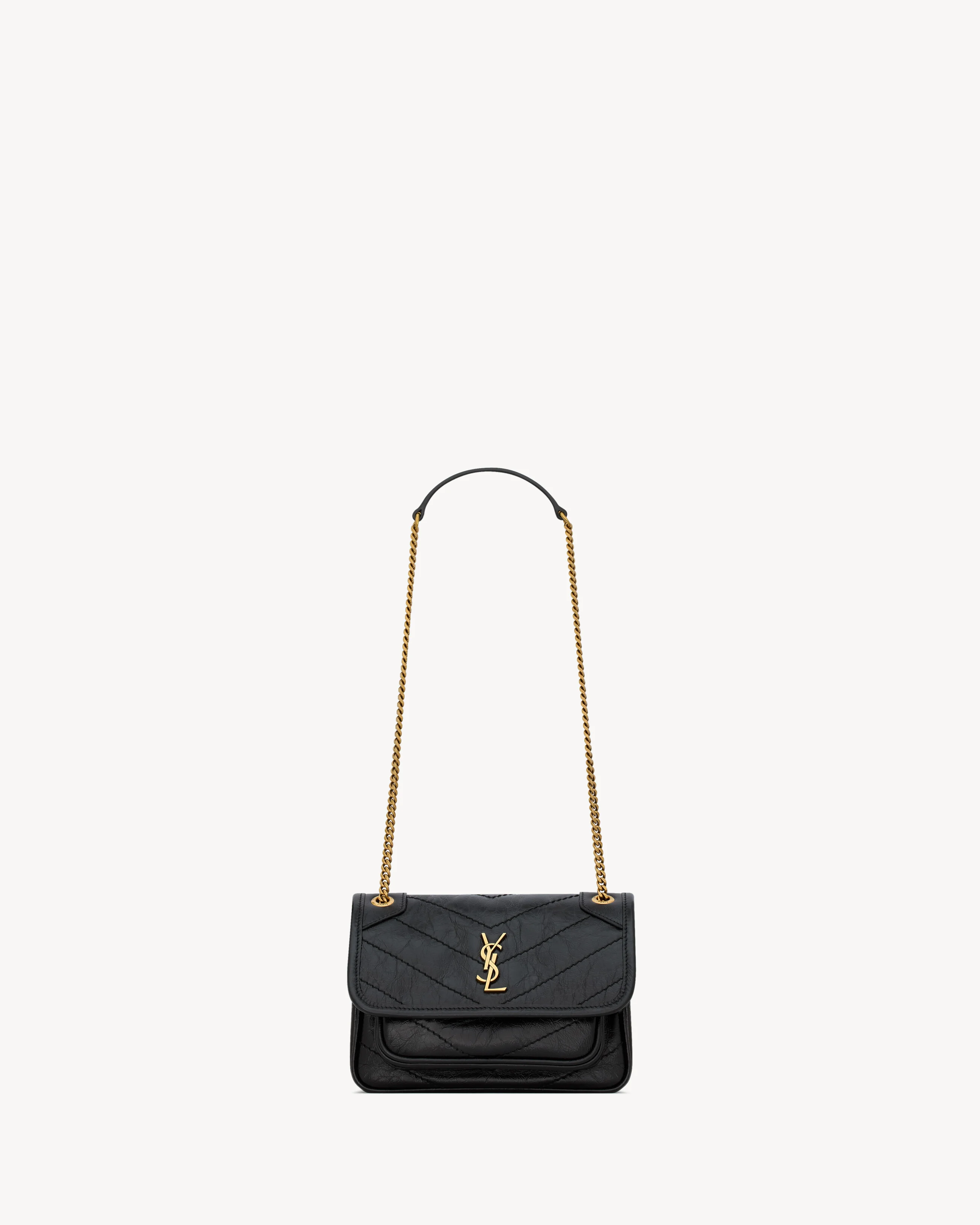 THE MINI VERSION OF THE ICONIC NIKI, MADE WITH METAL-FREE VINTAGE LEATHER AND LINED WITH CERTIFIED COTTON. THIS PRACTICAL, LIGHTWEIGHT BAG FEATURES TWO MAIN COMPARTMENTS AND A BACK POCKET. A SLIDING CHAIN STRAP PROVIDES BOTH SHOULDER AND CROSSBODY CARRY OPTIONS. - CHROME-FREE, METAL-FREE TANNED LEATHER - CERTIFIED COTTON LINING - BRONZE-TONE HARDWARE - MAGNETIC SNAP CLOSURE - TWO MAIN COMPARTMENTS - ONE FLAT POCKET - ONE FLAT POCKET AT THE BACK - DIMENSIONS: 18 X 12.5 X 5 CM / 7.1" X 4.9" X 2" - SINGLE-STRAP DROP: 55 CM / 21.7" - DOUBLE-STRAP DROP: 30 CM / 11.8" - CALFSKIN BRASS - STYLE ID 8460870EN071000 - MADE IN ITALY