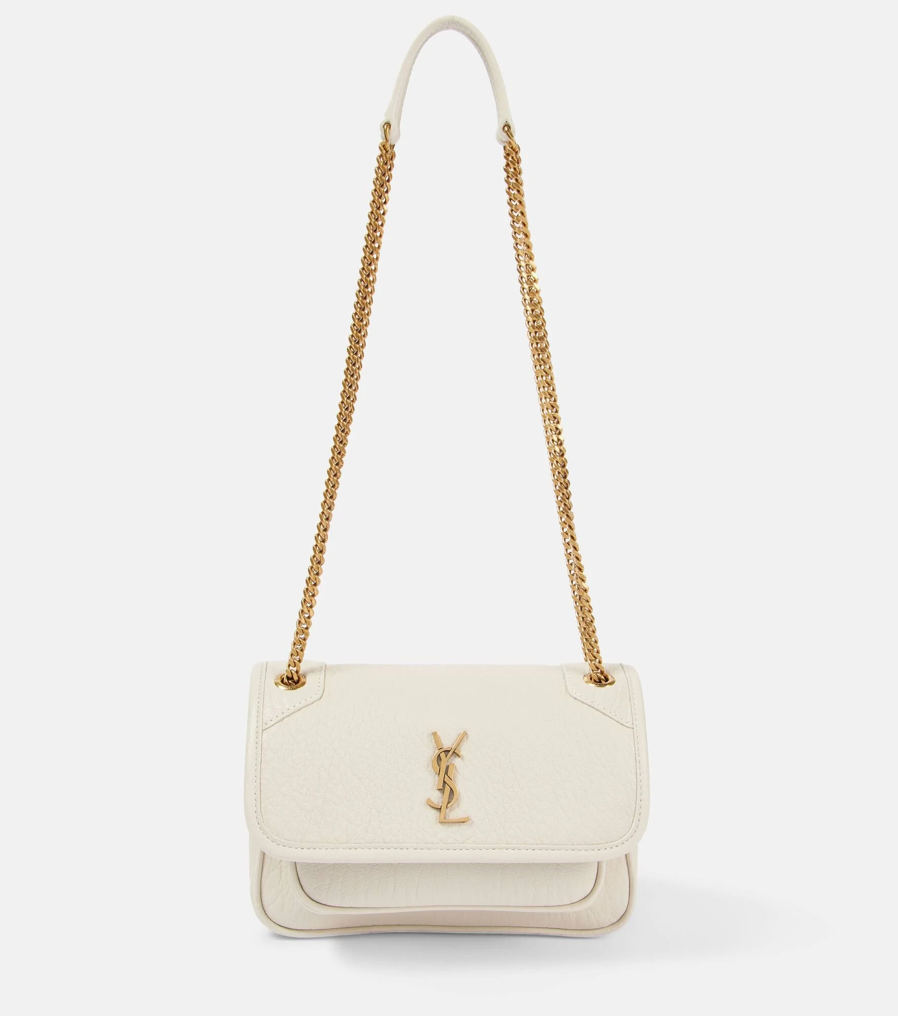 Product Details - Material: leather - Lining: leather - Made in Italy - Designer color name: Blanc Vintage - Item color: white - Closure: magnetic-tab fastening - Chain and leather shoulder strap - Hardware color: bronze - Color of strap: bronze - Internal details: internal slot pocket - Front pocket under flap - Back pocket - Includes: box, dust bag - Item number: P01040431 Size & Fit - Height 13cm-5" - Width 18cm-7" - Depth 5,5cm-2" - Min. length of handles 62cm-24.5" - Max. length of handles 110cm-43.5"