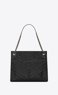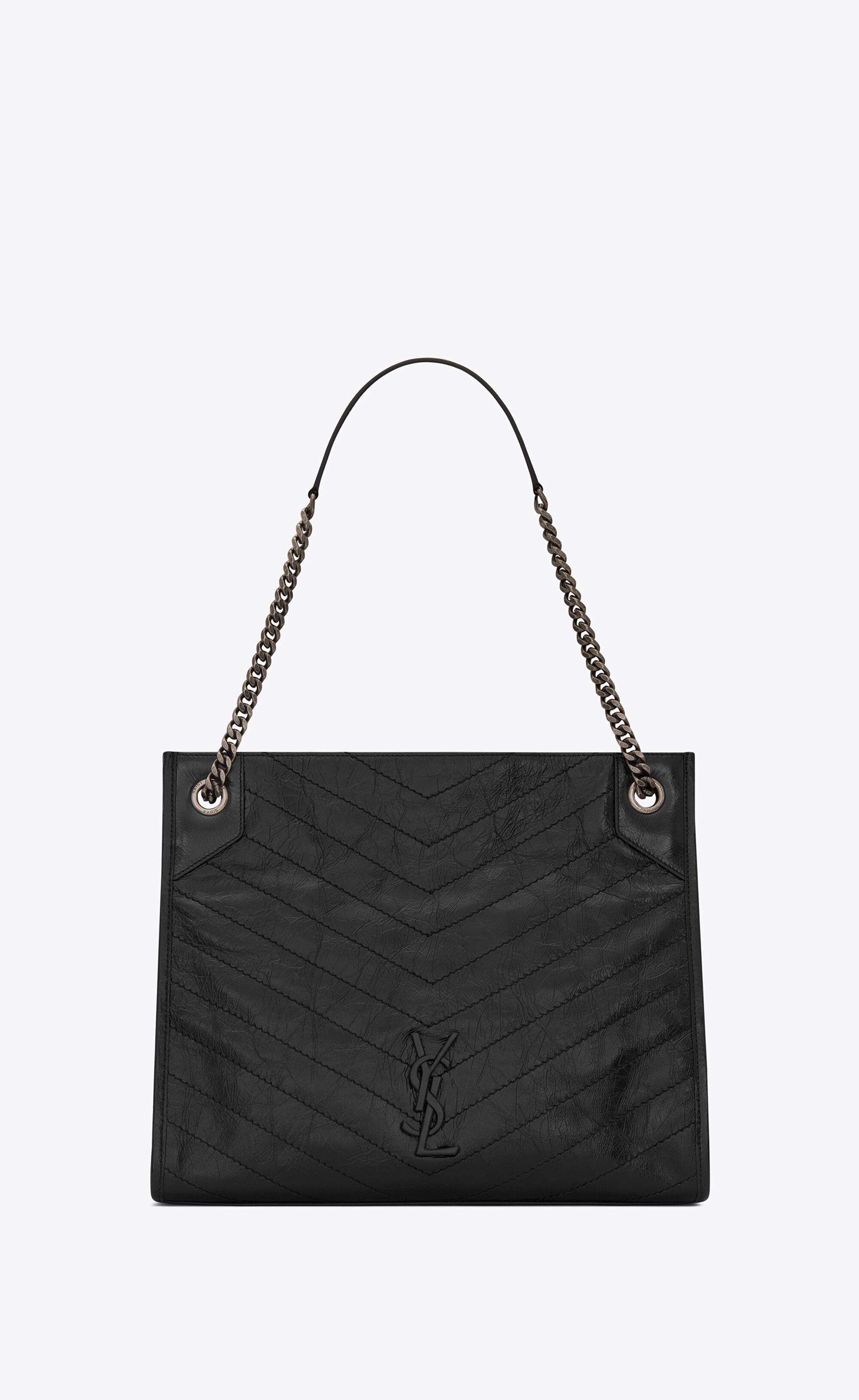 SAINT LAURENT MONOGRAM TOTE DECORATED WITH LEATHER-COVERED YSL INITIALS AND QUILTED OVERSTITCHING, FEATURING LEATHER-REINFORCED CHAIN HANDLES. EXCLUSIVELY IN SAINT LAURENT BOUTIQUES AND ON YSL.COM ONLY - 100% CALFSKIN LEATHER - DIMENSIONS: 33 X 27 X 11,5 CM / 12.9 X 10.6 X 4.5 INCHES - SILVER-TONED METAL HARDWARE - GROSGRAIN LINING - MAGNETIC SNAP BUTTON FASTENING - ONE INSIDE ZIPPERED POCKET, ONE OPEN POCKET - HANDLE DROP: 27 CM - STRAP DROP: 47 CM - STYLE ID 808891188 - MADE IN ITALY