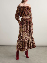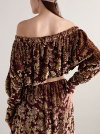 Channeling the founder's nights partying on the Rive Gauche with his muses, SAINT LAURENT's blouse is pure '70s glamour. It's made from floral devore-velvet woven with glittering threads, and has a ruched off-the-shoulder neckline and elasticated hem. Size & Fit - Fits true to size, take your normal size - Designed for a relaxed fit - Elasticated at the neckline for a flexible fit - Mid-weight, non-stretchy fabric - Model is 177cm/ 5'10" and is wearing a FR 36 Model measurements: - Bust: 81cm/ 32” - Waist: 66cm/ 26” - Hip: 90cm/ 35.5” Details & Care - Burgundy and gold devore-velvet - Slips on - 48% viscose, 30% silk, 22% polyester