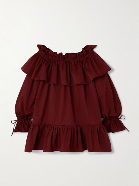 Off-the-shoulder ruffled cotton-twill mini dress Brick