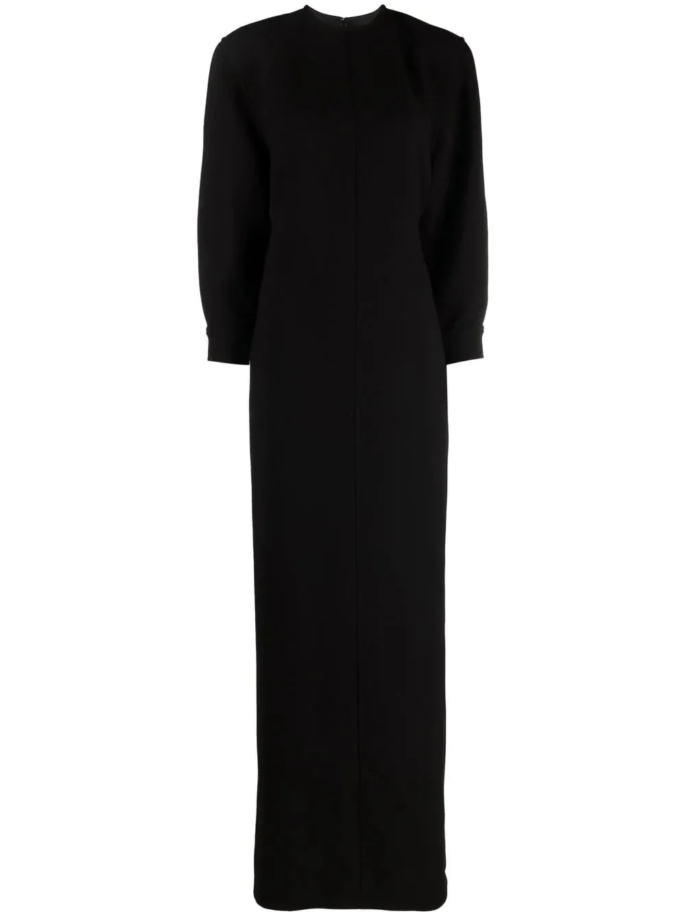 open-back maxi dress Highlights - Black - Wool/silk - Flared - Round neck - Rear tie fastening - Long sleeves - Buttoned cuffs - Rear slit - Maxi Made in Italy Composition Lining: Silk 100% Outer: Wool 100%, Acetate 52%, Viscose 48% SIZE & FIT Model measurements Height 5 ft 11 in(1.8 m) Bust/Chest 32.67 in(83 cm) Hips 36.22 in(92 cm) Waist 24.4 in(62 cm) Measurement HIPS 34.64 in(88 cm) LENGTH 65.35 in(166 cm) WAIST 28.34 in(72 cm) FittingInformation This piece fits true to size. We recommend you get your regular size Designed for a close fit at the bust, waist and hips Made with a mid-weight non-stretch fabric Washing instructions Dry Clean Only