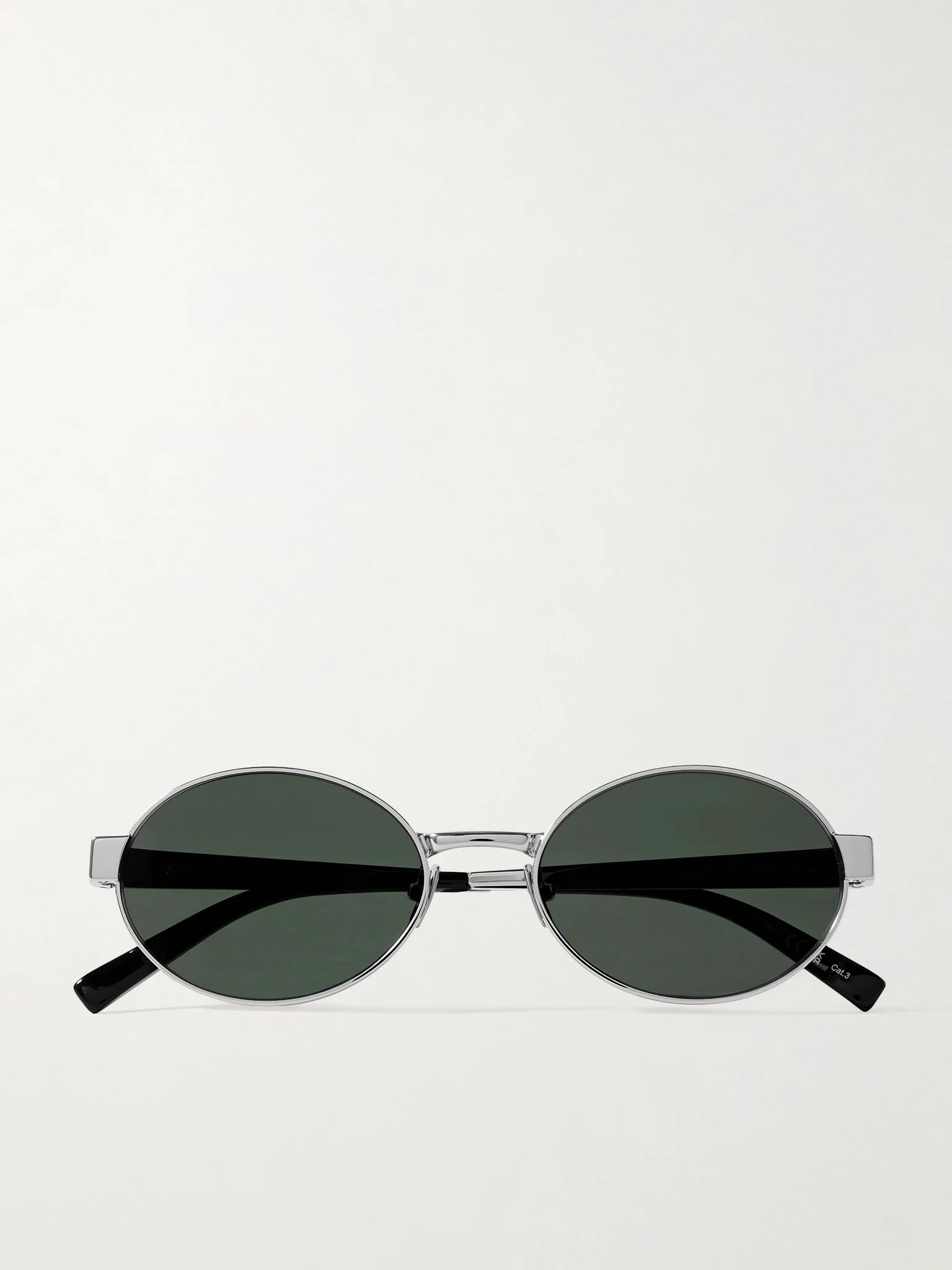 Taking cues from popular '90s styles, SAINT LAURENT's oval-frame sunglasses are re-imagined to suit the sleek modern aesthetic. They're made from silver-tone metal and have black lenses that match the acetate tips and the label's moniker etched along the arms. Details & Care - Silver-tone metal - Come with a case - 100% UV protection