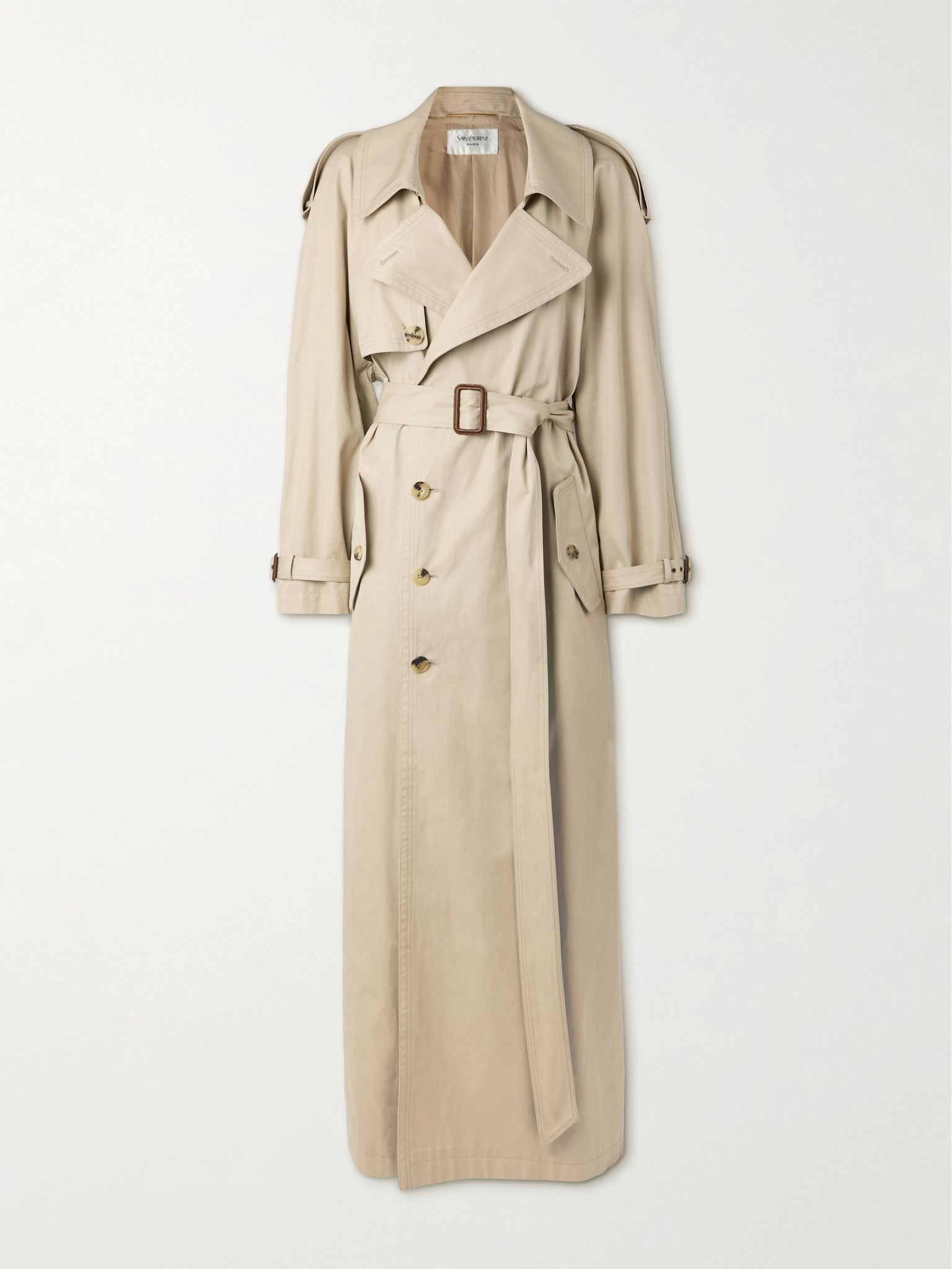 When it comes to trans-seasonal dressing, there's no better investment than a classic trench coat. SAINT LAURENT's iteration is made from cotton-twill and has the typical shoulder epaulettes, generous storm flap and double-breasted front. The detachable belt allows you to cinch the oversized shape, while the beige shade will go with just about everything in your closet. Size & Fit - Fits true to size, take your normal size - Designed for a relaxed fit, use the belt to cinch in at the waist - Mid-weight, non-stretchy fabric - Model is 177cm/ 5'10" and is wearing a FR 36 Model measurements: - Bust: 81cm/ 32” - Waist: 66cm/ 26” - Hip: 90cm/ 35.5” Details & Care - Beige cotton-twill - Button fastenings through double-breasted front - 100% cotton; buttons: 100% horn (Buffalo); lining: 100% silk