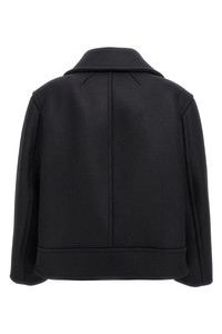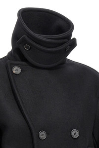cod. 810508Y080W1000 Oversize double-breasted wool caban coat with button closure, pockets, two-way ulster collar with chin guard, padded shoulders, long sleeves. Color: Black Size & Fit: oversized fit Composition: 100% virgin wool Made in: Italy
