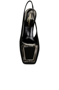 Details - Crepe de chine upper with leather sole and silver-tone hardware - Made in Italy - Slingback styling - Exaggerated buckle accent at vamp - Leather lining with Saint Laurent logo print - Square toe with pin heel - Approx 114mm/ 4.5 inch heel - This item is not available to ship to Indonesia - Our Style No. SLAU-WZ939 - Manufacturer Style No. 698174-AAAKY-1000