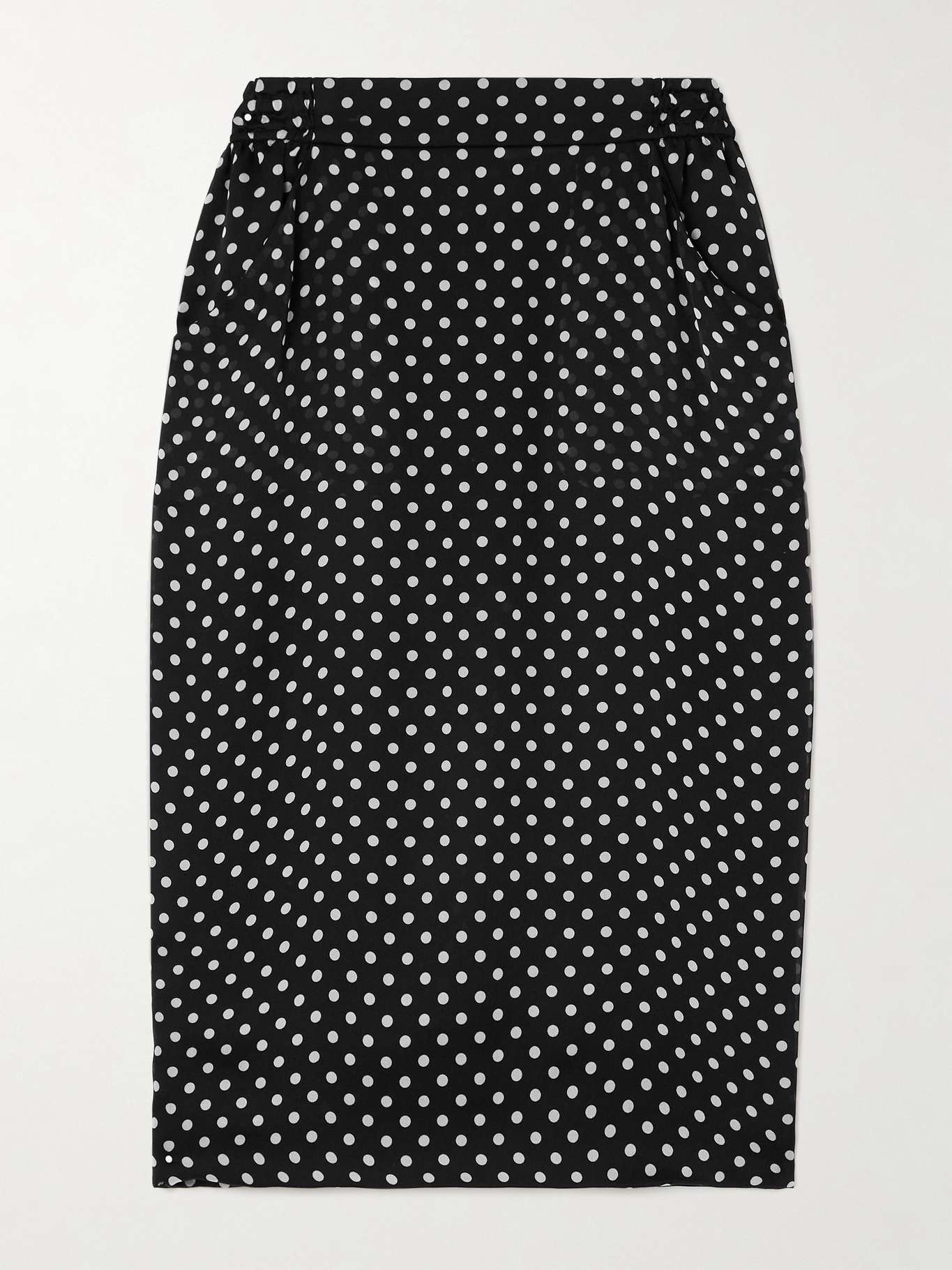 EDITORS'NOTES SAINT LAURENT's midi skirt is made from lightweight silk-chiffon patterned with classic polka-dots. It has a partially elasticated waistband for comfort and draped side panels where discreet pockets sit. Wear yours with a tonal tank and pumps. SIZE & FIT Model measurements: - Fits true to size, take your normal size - Knee-length, designed to be worn at the waist - Lightweight, non-stretchy fabric - Model is 177cm/ 5'10" and is wearing a FR 36 - Bust: 79cm/ 31" - Waist: 61cm/ 24" - Hip: 89cm/ 35" DETAILS & CARE - Black and white silk-chiffon - Concealed hook and zip fastening at back - 100% silk - Dry clean
