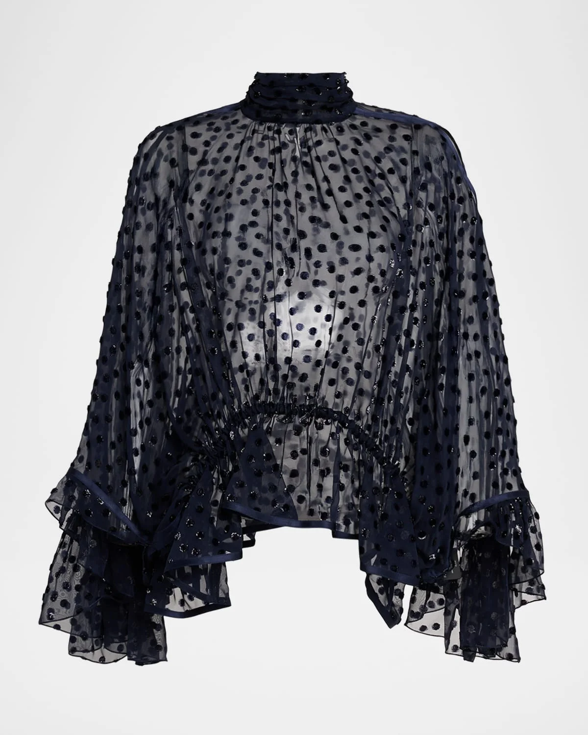 - Sheer organza fabric elevated with a delicate velvet polka dot pattern gives this Saint Laurent blouse an ethereal, romantic design - Ideal for layering with a bralette or camisole underneath or wearing on its own - High ruffled neckline - Billowy long sleeves; wide, flowing cuffs - Hip length - Cinched waist with ruffled peplum hem - Button-and-loop closures behind the neck - Cotton/silk - Made in Italy