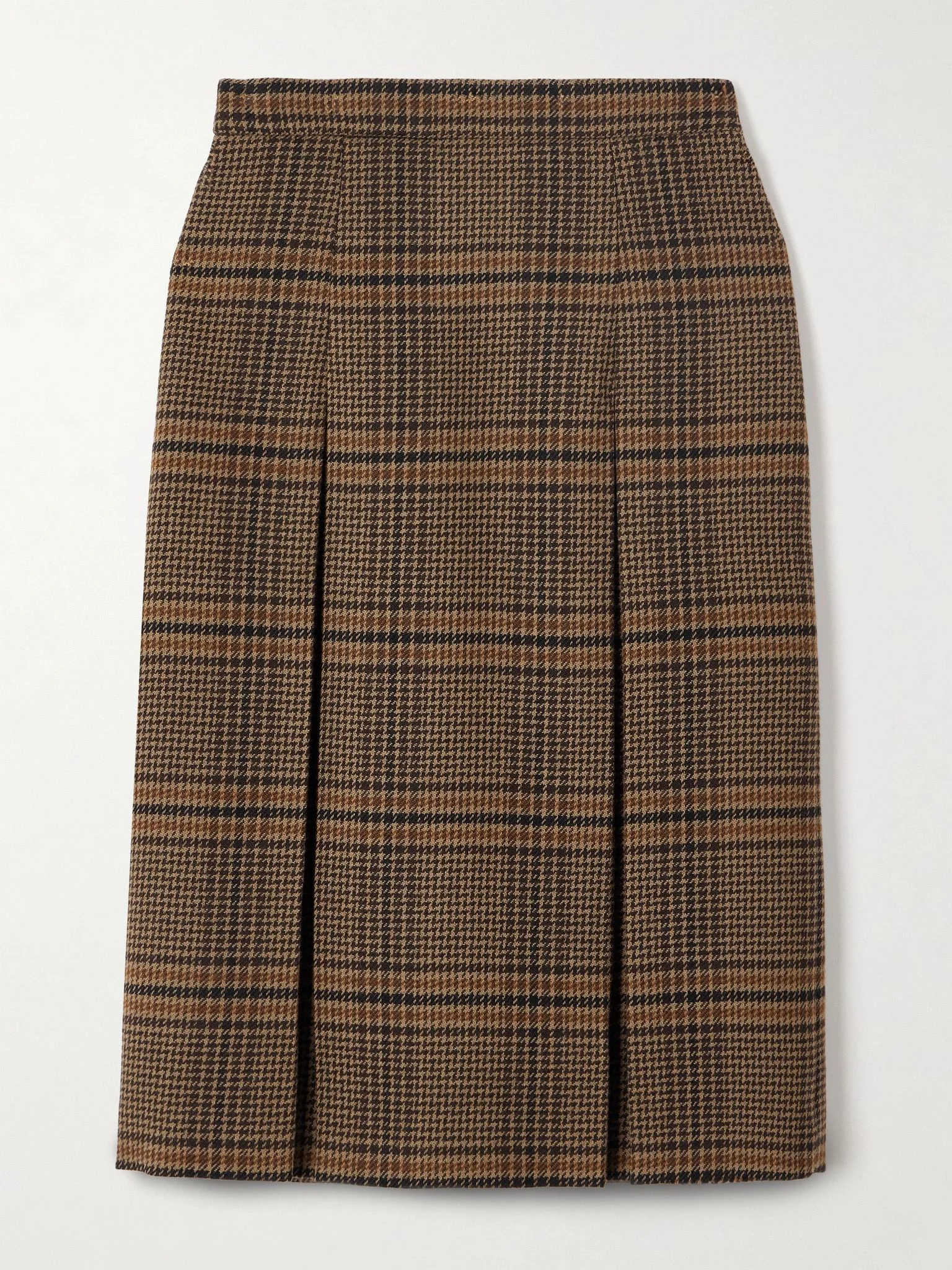 Prince of Wales checks make SAINT LAURENT's midi skirt feel so timeless. Made from wool and partially lined in silk, it has inverted pleats and discreet pockets at the sides. Wear yours with a pussy-bow blouse from the label. Size & Fit - Fits true to size, take your normal size - Midi-length, designed to be worn just below the natural waist - Mid-weight, non-stretchy fabric - Model is 177cm/ 5'10" and is wearing a FR 36 Model measurements: - Bust: 80cm/ 31.5" - Waist: 60cm/ 23.5" - Hip: 89cm/ 35" Details & Care - Tonal-brown wool - Concealed hook and zip fastening at side - 100% wool; lining: 100% silk - Partially lined - Dry clean