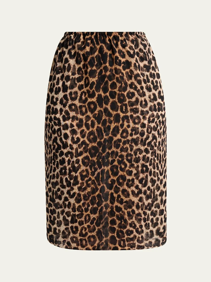Saint Laurent skirt is crafted of a sheer silk georgette with a leopard print and an elasticized waistband High waist Side split pockets Knee length Skirt falls straight from hip to hem Pull-on style Silk Made in France Online Inquiries: BGS21_BB18P| Store Inquiries: #5433943