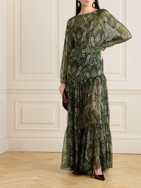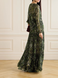 Pussy-bow shirred printed metallic silk-crepon maxi dress Brown