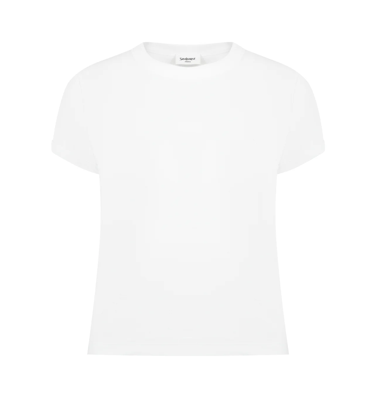 SAINT LAURENT Ribbed T-Shirt featuring fitted crewneck, short sleeves and a tonal logo patch at the chest. 100% cotton. Made in France. DESIGNER STYLE ID: 869630-Y38BD COLOR: 9000 BLANC