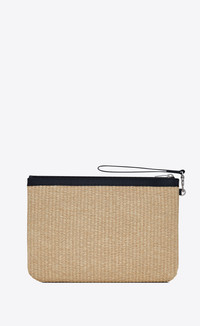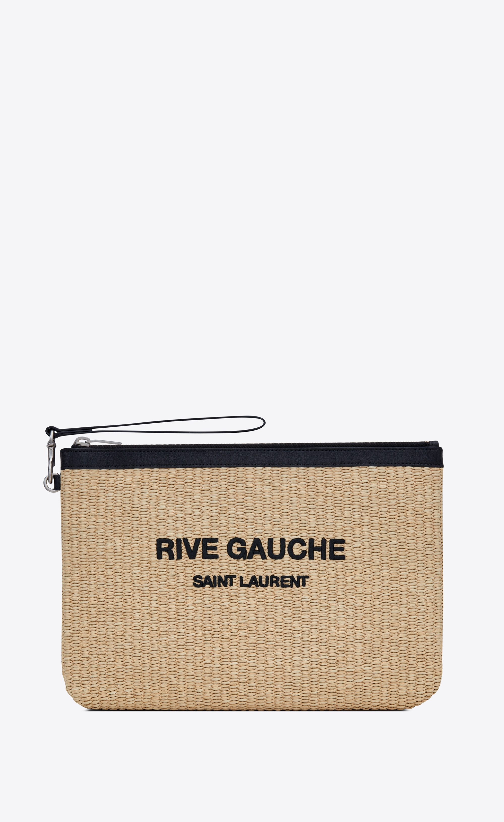 ZIPPERED BEACH POUCH EMBROIDERED WITH RIVE GAUCHE SAINT LAURENT, FEATURING A REMOVABLE LEATHER HANDLE. - 63% VISCOSE,37% COTTON - DIMENSIONS: 30,5 X 21 X 1,5 CM / 12 X 8.2 X 0.5 INCHES - SILVER-TONED METAL HARDWARE - GROSGRAIN LINING - ZIP CLOSURE - INTERIOR: ONE MAIN COMPARTMENT - ONE FLAT POCKET - HANDLE DROP: 15 CM - STYLE ID 809656943 - MADE IN ITALY