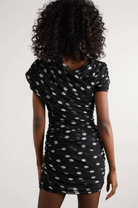 EDITORS'NOTES SAINT LAURENT's mini dress has an '80s sensibility, which is quintessential to the house. Patterned with large white polka dots, it's cut from semi-sheer tulle with a ruched body and draped, asymmetric neckline. Style yours with sharply pointed pumps and oversized earrings. SIZE & FIT Product measurements: - Fits true to size, take your normal size - Designed for a close fit - Particularly short in length - Lightweight, slightly stretchy fabric - Model is 177cm/ 5'10" and is wearing a FR 34 - Bust: 93cm / 36.6in - Shoulder: 47cm / 18.5in - Waist: 67cm / 26.4in - Hip: 75cm / 29.5in - Length: 80cm / 31.5in DETAILS & CARE - Black and white silk-chiffon - 100% silk; lining: 100% viscose - Dry clean