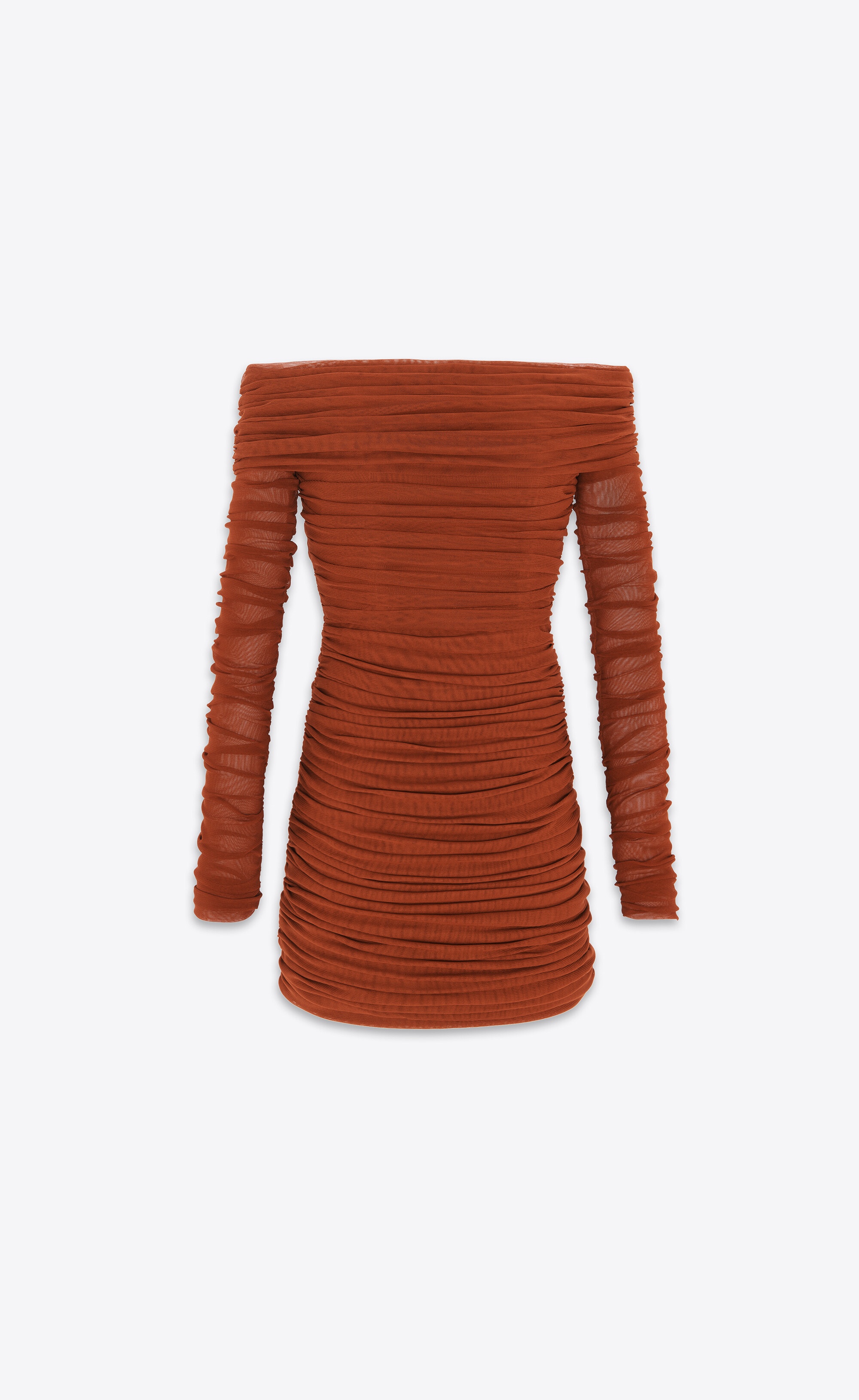 LONG-SLEEVE MINI DRESS WITH AN OFF-THE-SHOULDER NECKLINE AND ALL-OVER RUCHING. THE FABRIC IS DELICATE, PLEASE DO NOT STEAM AND DO NOT IRON. - 100% POLYAMIDE - CONCEALED HOOK AND ZIP CLOSURE AT THE SIDE - OFF-THE-SHOULDER NECKLINE - CONCEALED ZIP CUFFS - STYLE ID 782644Y4C076243 - MADE IN ITALY