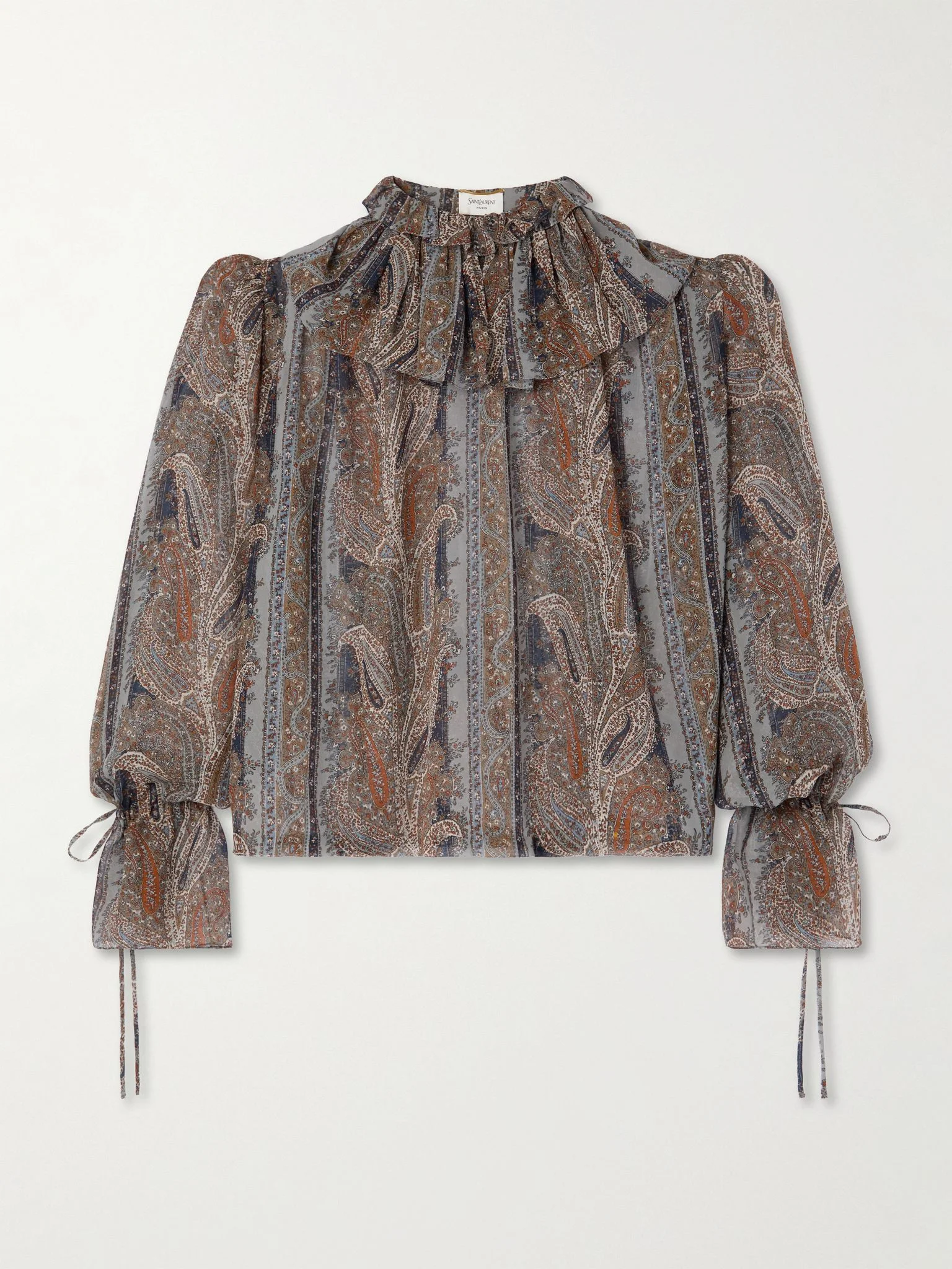 Each detail of SAINT LAURENT’s blouse is carefully considered. It’s been made in Italy from fluid silk patterned with ornate paisleys and has a lightly gathered Pierrot collar and drawstring poet sleeves. Style yours solo with jeans or layered under one of the house's jackets. Size & Fit - Fits true to size, take your normal size - Designed for a relaxed fit - Lightweight, semi-sheer, non-stretchy fabric - Model is 177cm/ 5'10" and is wearing a FR 36 Model measurements: - Bust: 81cm/ 32" - Waist: 62cm/ 24.5" - Hip: 89cm/ 35" Details & Care - Multicolored silk - Concealed button fastenings through front - 100% silk - Dry clean