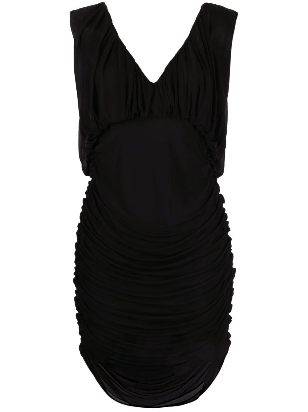ruched V-neck minidress Vertical ruching enhances the plunging V-neckline of this Saint Laurent minidress, draping loosely over the skirt. The gathered detailing is repeated horizontally around the bottom half for contrast. Highlights - Black - Ruched detailing - Plunging v-neck - Sleeveless - V-back - Curved hem - Above-knee length Made in Italy Composition Cupro 100% SIZE & FIT Model measurements Height 5 ft 10 in(1.77 m) Bust/Chest 32.28 in(82 cm) Hips 35.03 in(89 cm) Waist 25.19 in(64 cm) Measurement LENGTH 32.28 in(82 cm) WAIST 22.04 in(56 cm) HIPS 26.77 in(68 cm) FittingInformation Designed for a loose fit at the chest with a close fit over the waist and hips Made from a midweight stretch fabric, this piece offers elasticity and flexibility when worn This piece fits true to size – take your usual size Washing instructions Dry Clean Only
