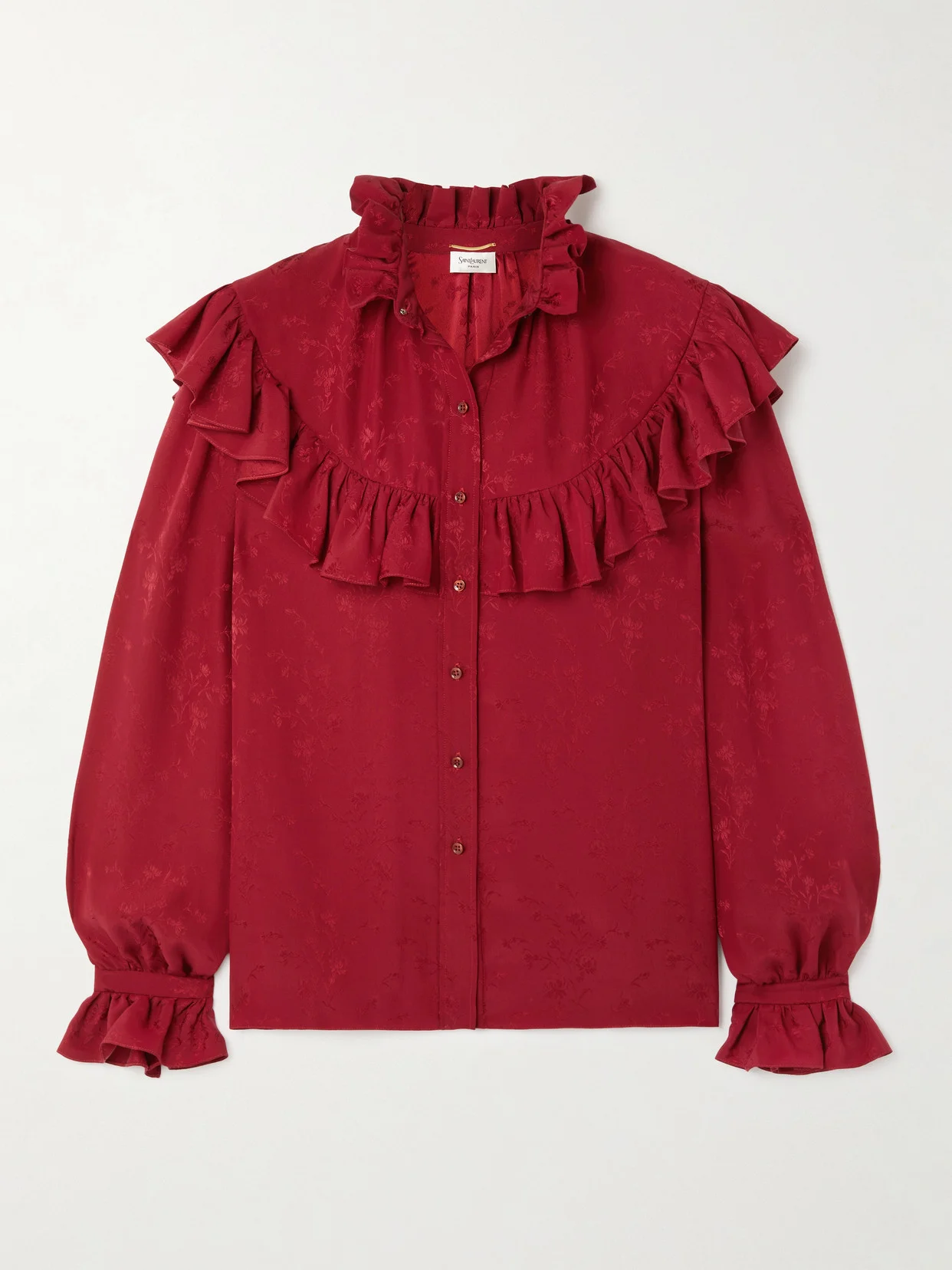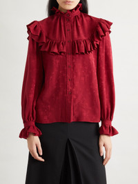 SAINT LAURENT's blouse has so many romantic details. Made from fluid silk, it's jacquard-woven with tiny florals and trimmed with ruffles along the yoke, collar and cuffs. The Pre-Fall '25 lookbook contrasted feminine styles like this with heritage fabrics.