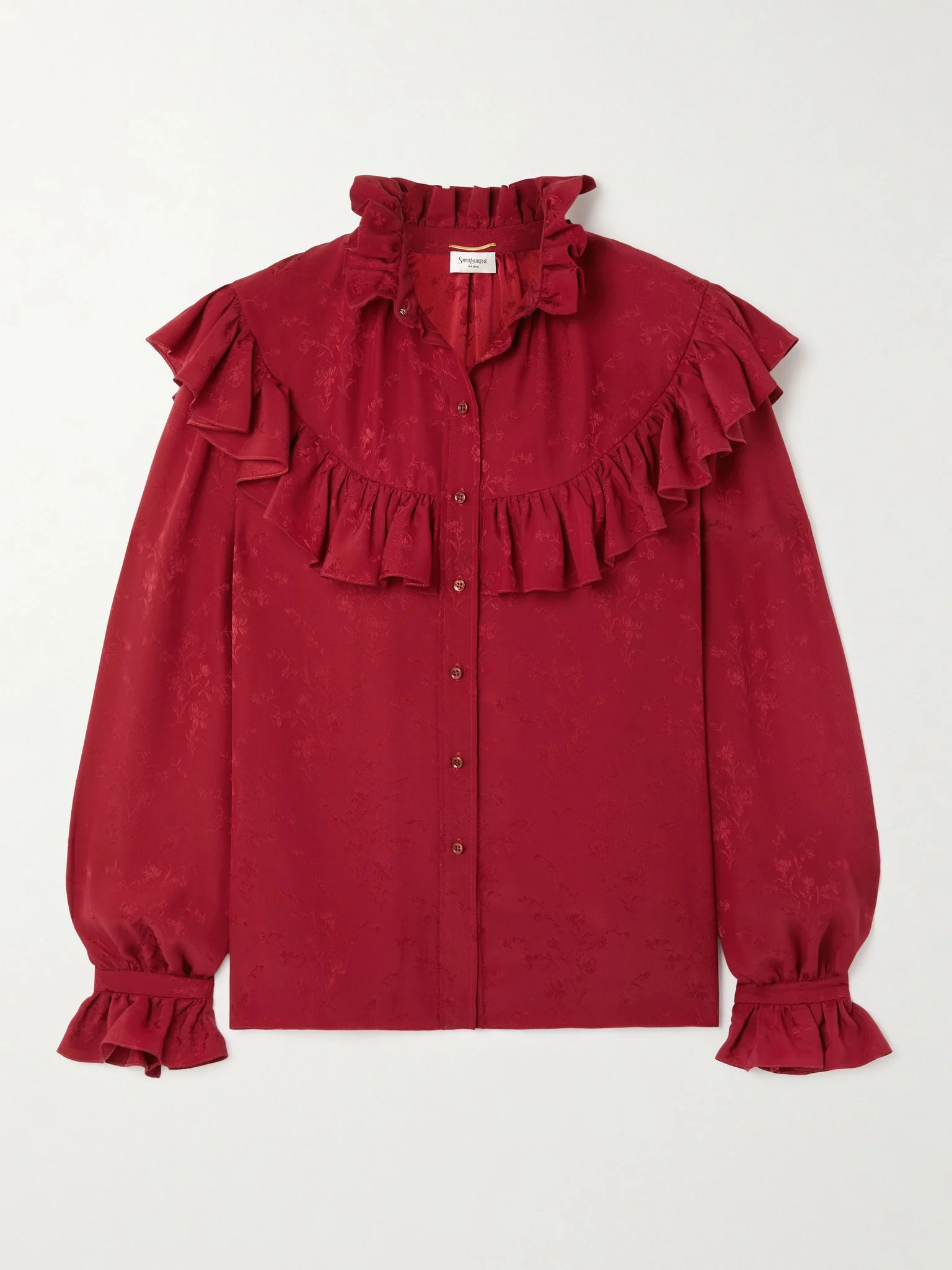 SAINT LAURENT's blouse has so many romantic details. Made from fluid silk, it's jacquard-woven with tiny florals and trimmed with ruffles along the yoke, collar and cuffs. The Pre-Fall '25 lookbook contrasted feminine styles like this with heritage fabrics. Size & Fit - Fits true to size, take your normal size - Cut for a loose fit - Mid-weight, non-stretchy fabric - Model is 180cm/ 5'11" and is wearing a FR 36 Model measurements: - Bust: 79cm/ 31" - Waist: 60cm/ 23.5" - Hip: 86cm/ 34" Details & Care - Red silk-jacquard - Button fastenings through front - 100% silk - Dry clean